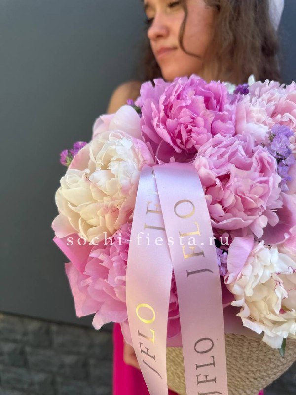 пионы, джутовое кашпо - D16, эвкалипт, лента, упаковка.