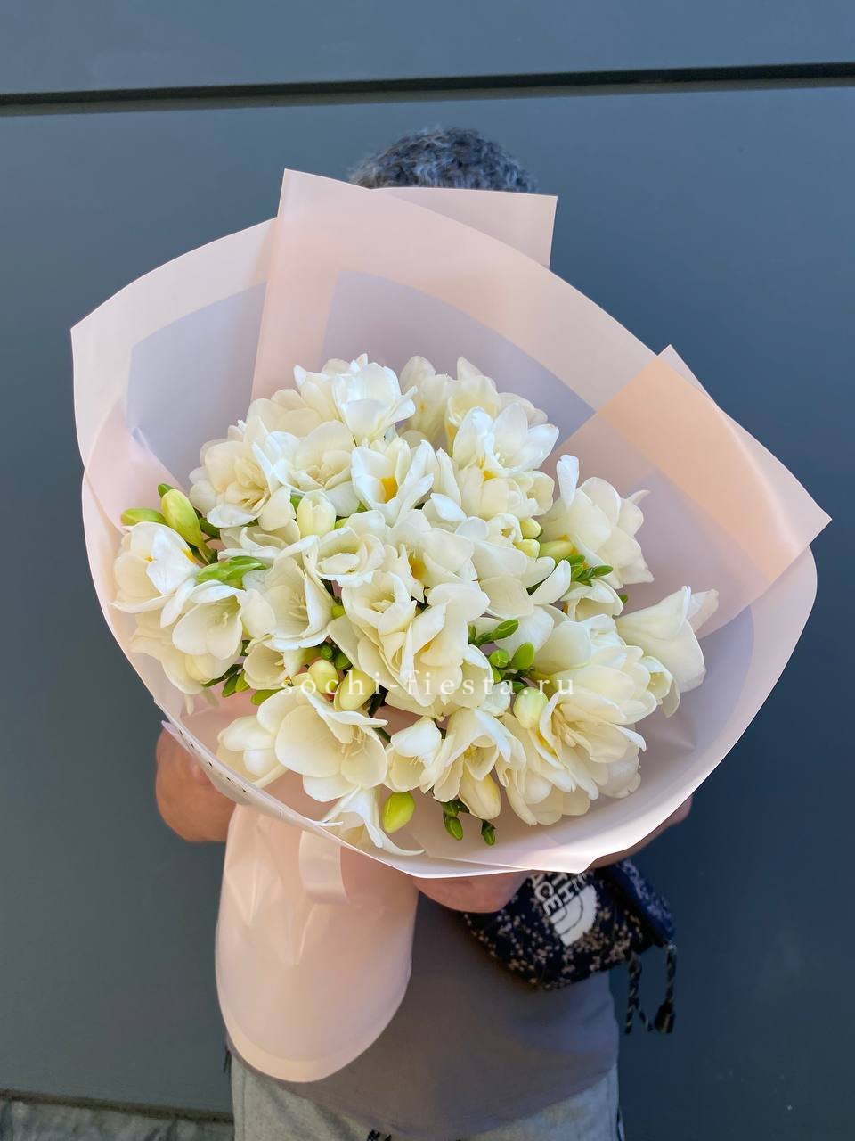 Состав: 25 белых фрезий, оформление, лента