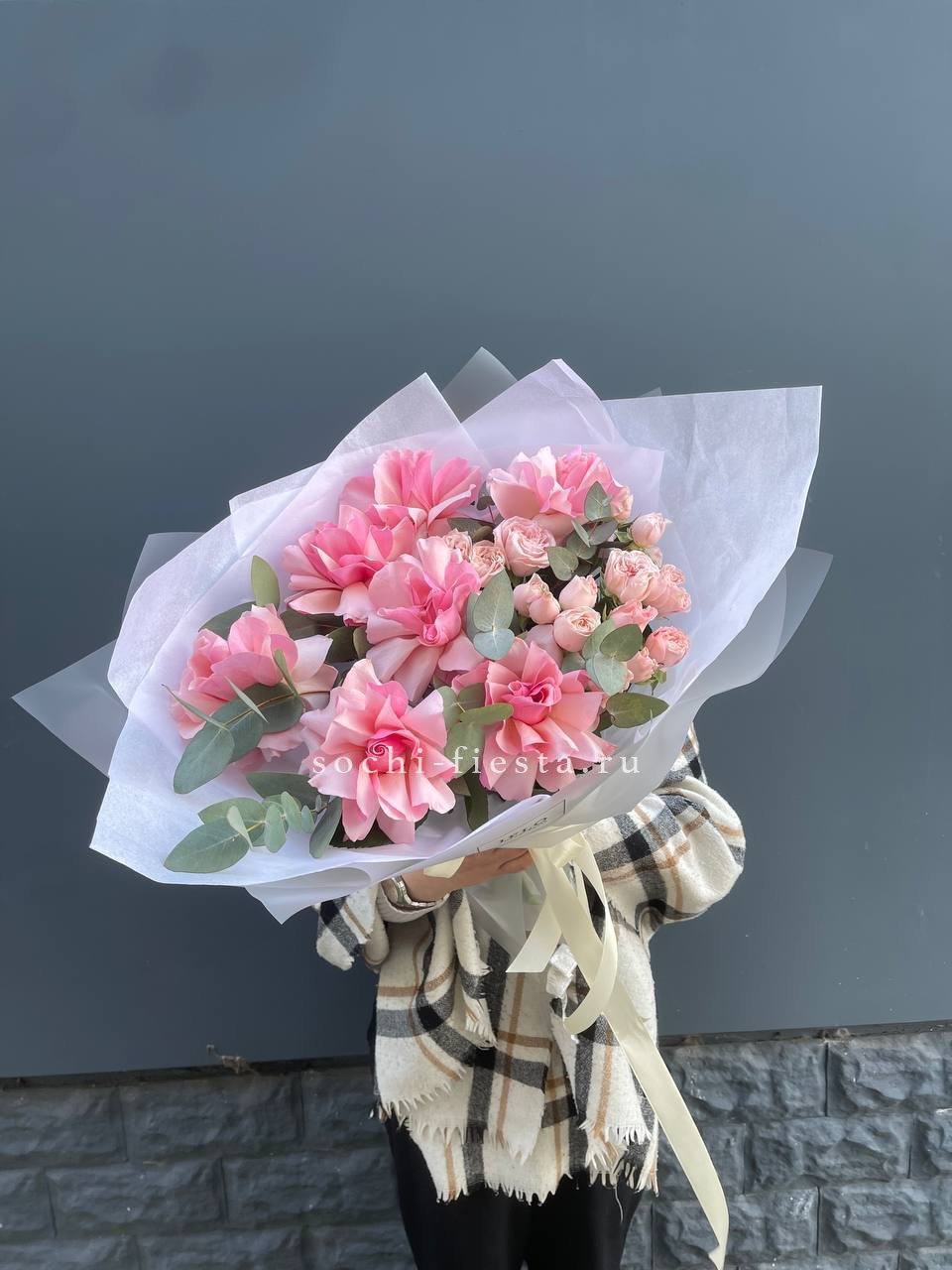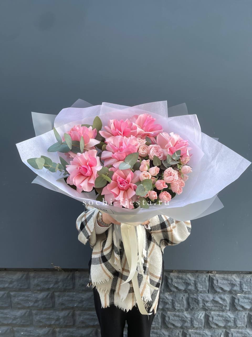 Этот букет — настоящий манифест женственности и ярких эмоций! Он выглядит очень эффектно за счет сочетания разных оттенков розового и игры фактур.