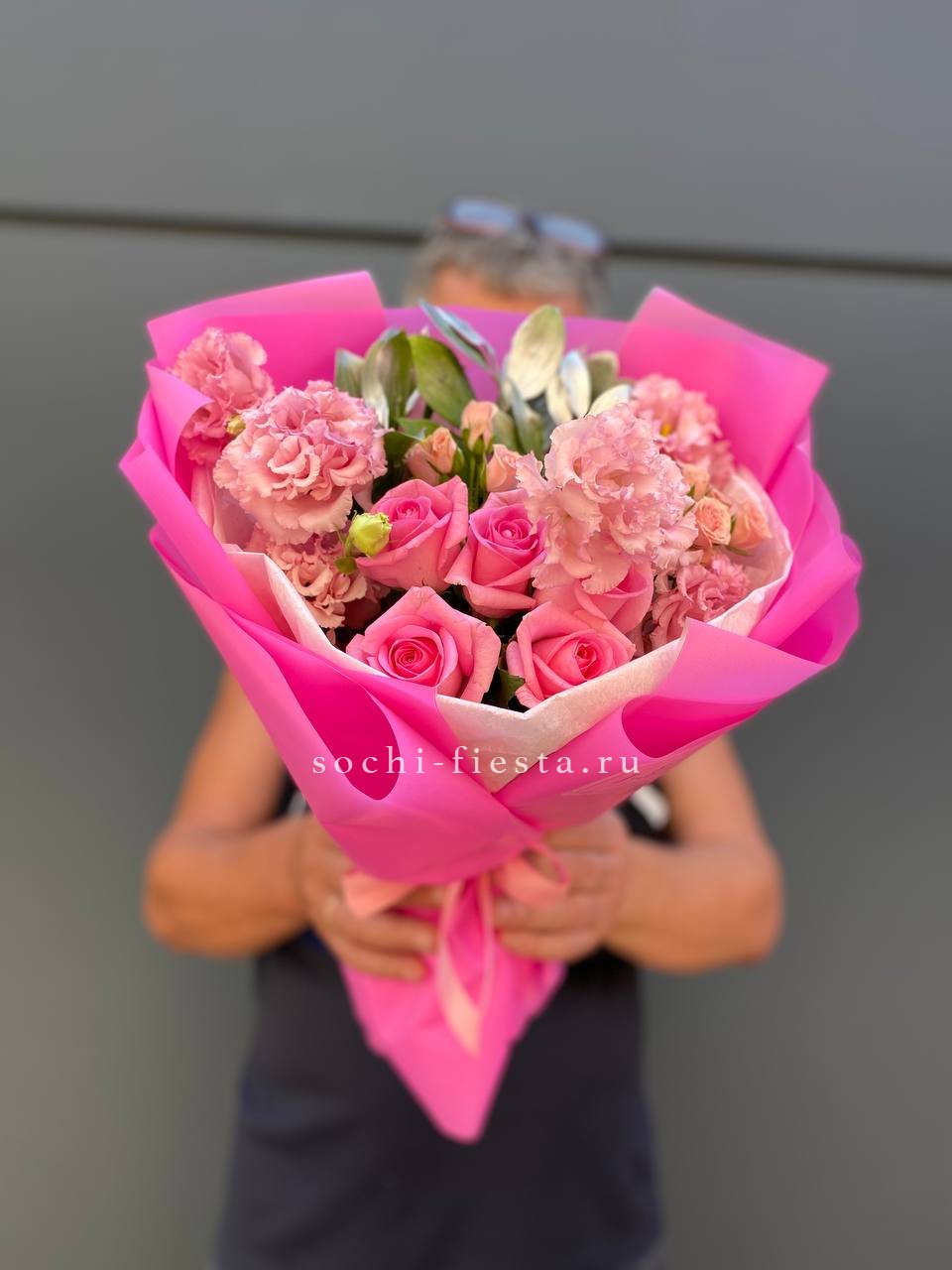 Розовые розы раскрываются среди воздушных соцветий гортензии и мелких бутонов диантуса. Озотамнус добавляет композиции лёгкость и объём. Букет собран плотно и держит форму без лишних деталей.