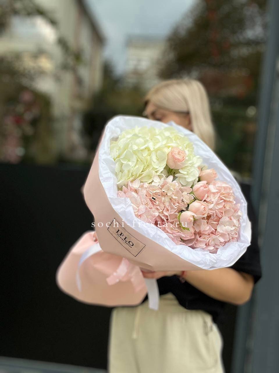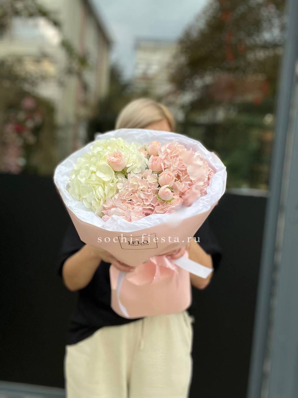 Гортензия создаёт воздушную базу, а герберы добавляют яркие точки цвета. Эвкалипт заполняет пространство между бутонами и придаёт композиции завершённость. Букет выглядит свежо и легко.