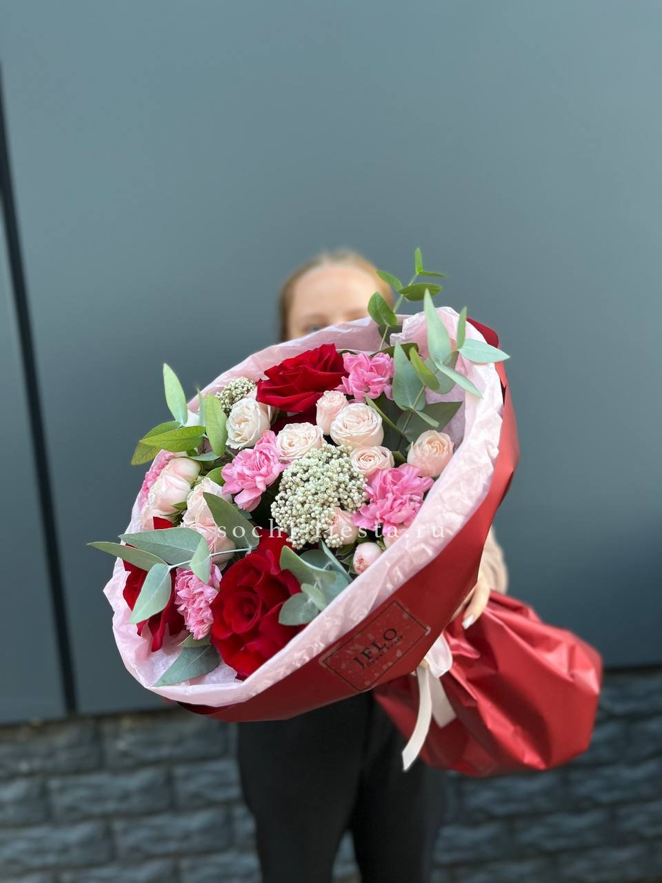 красная француская роза, диантусы, бомбастик, озатамус, эвкалипт, упаковка.