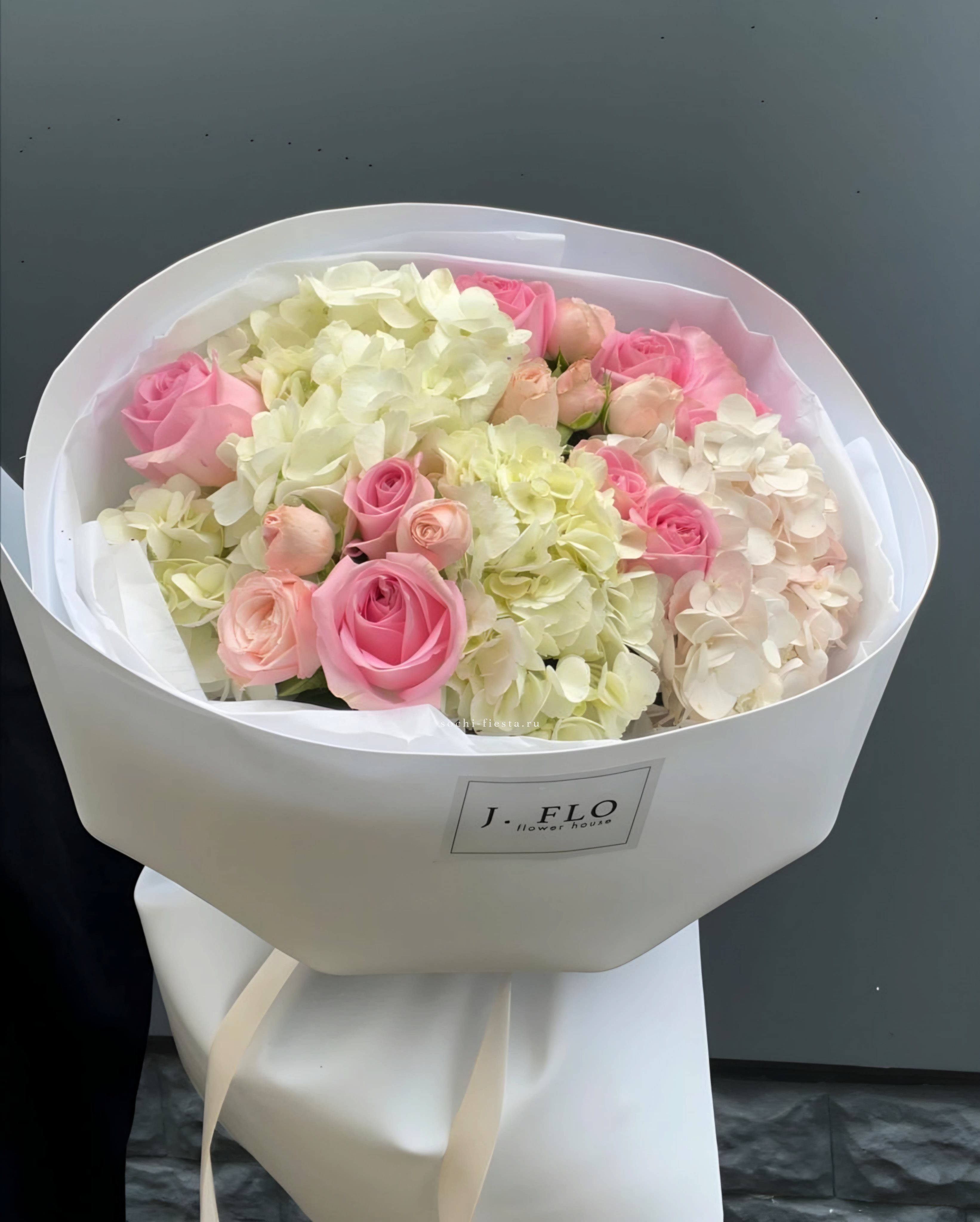 Пышные пионы встречаются с воздушными фрезиями в букете, который радует глаз многослойной структурой. Лепестки раскрываются постепенно, создавая живую композицию с выразительной глубиной.