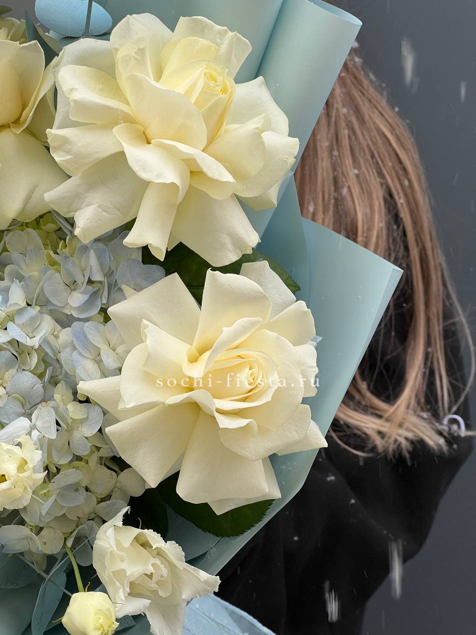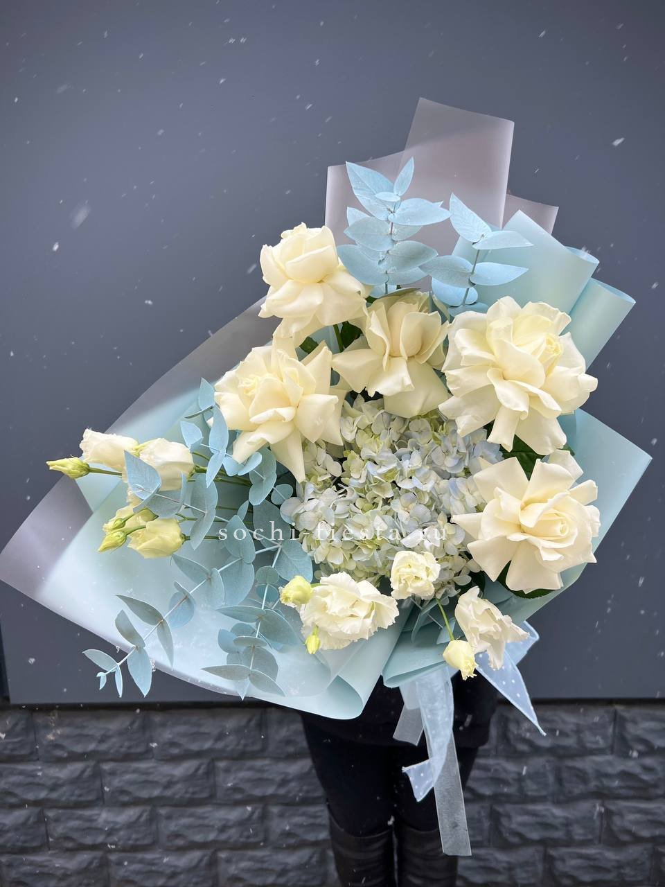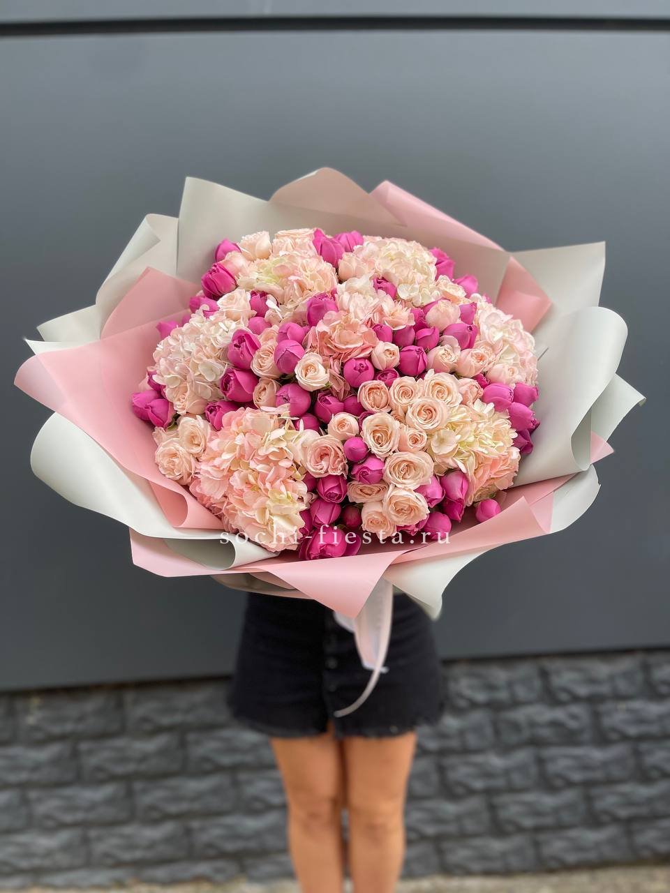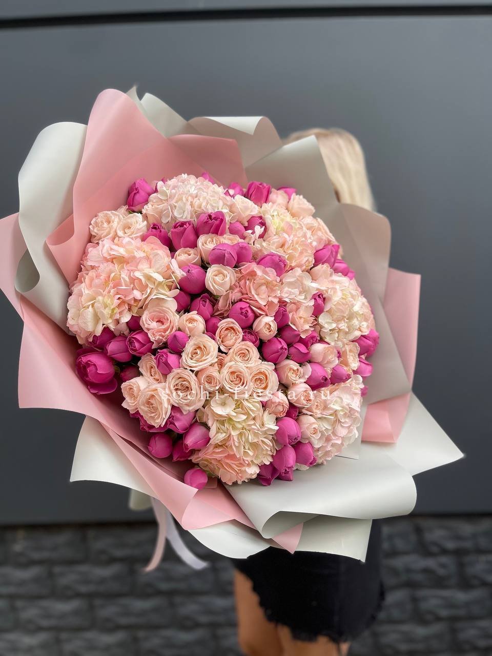 Крупные соцветия гортензии задают основной объем, а эустома и диантус разбивают плотность воздушными бутонами. Мисти баблс и озотамус рассыпаются между цветами, добавляя движение и легкость всей композиции.