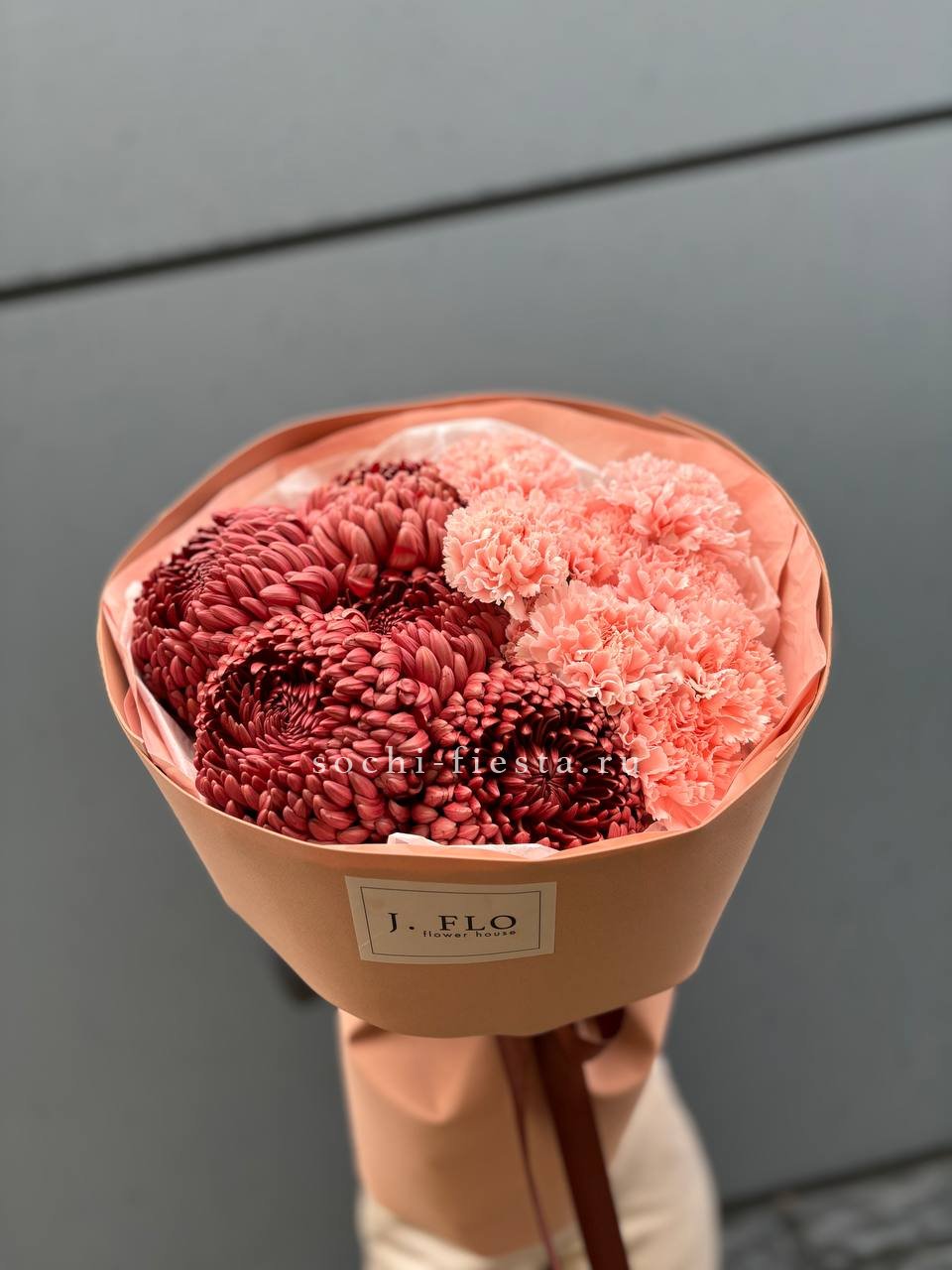 хризантемы Бигуди, диантусы, лента, дизайнерская упаковка.