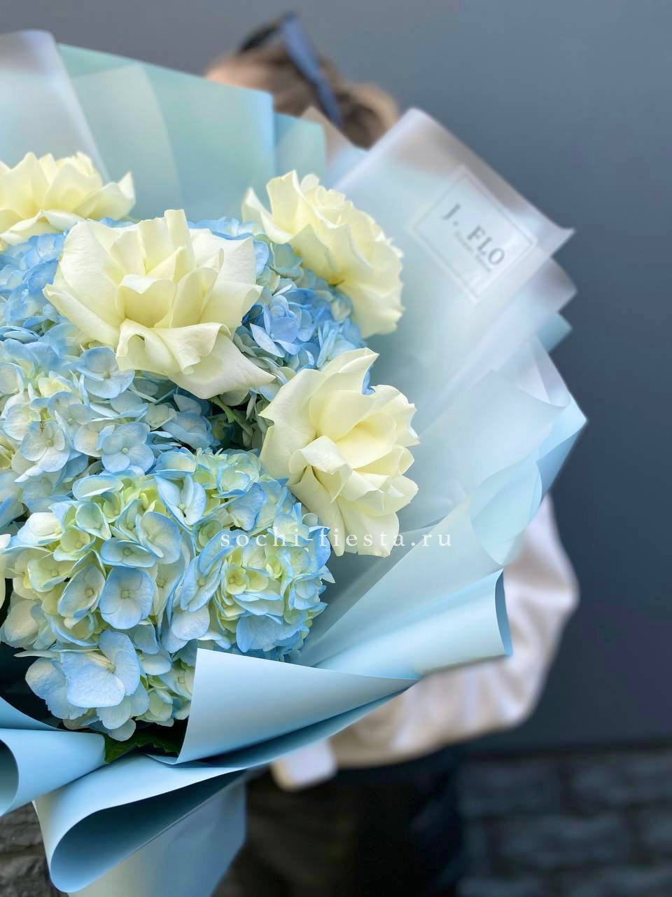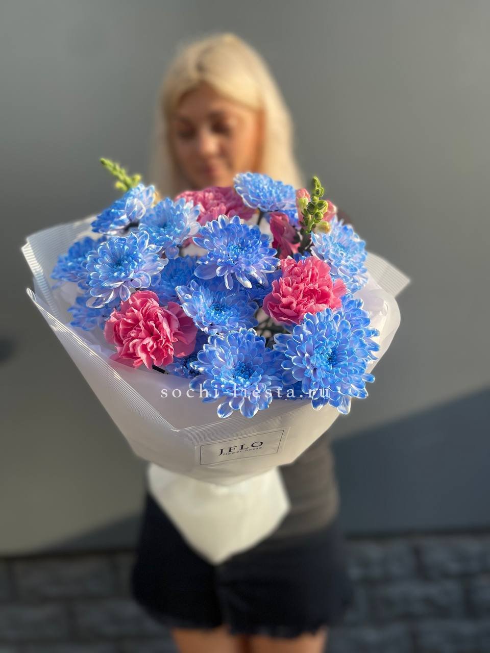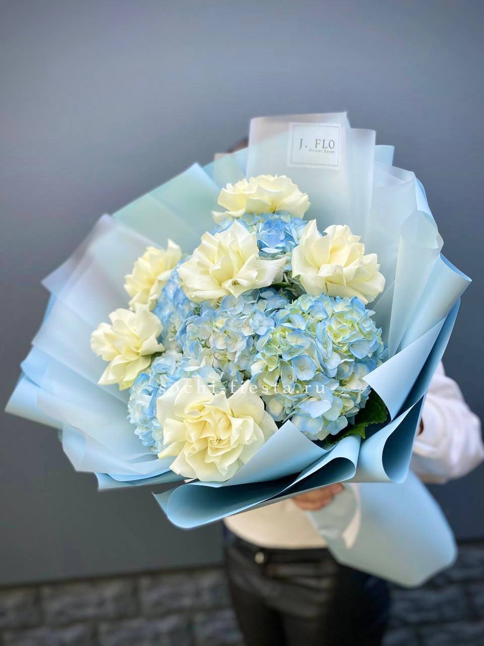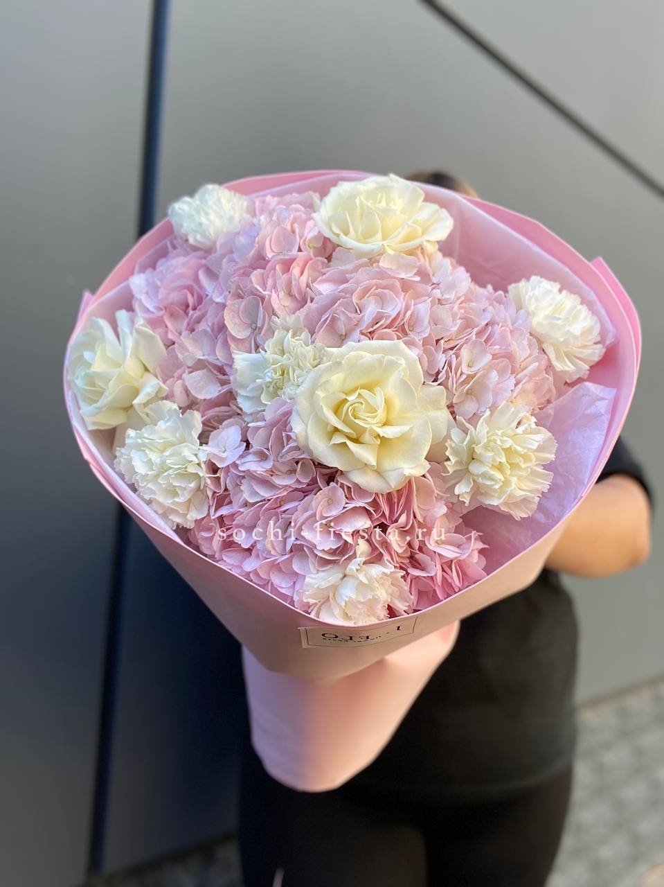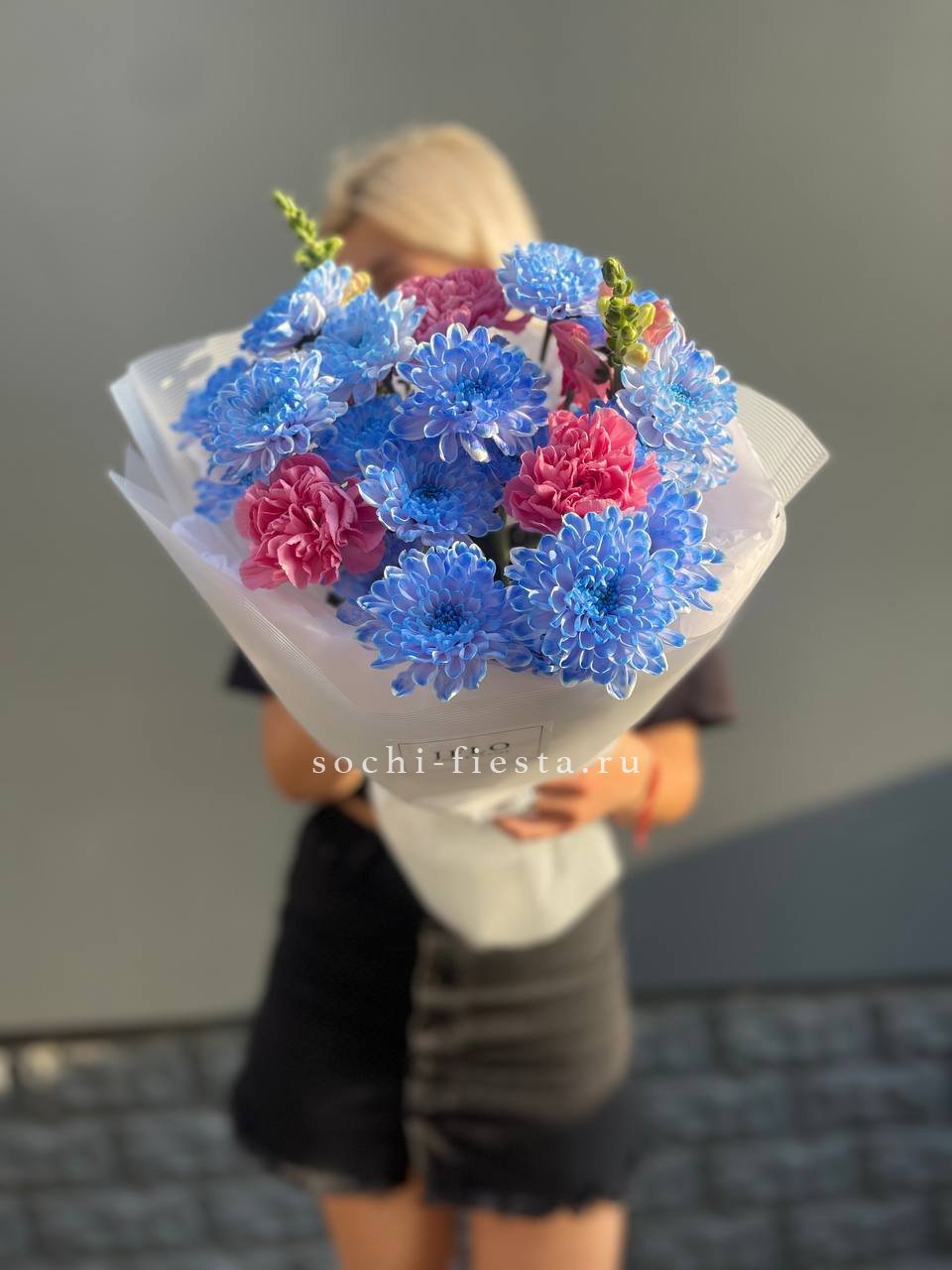 гортензия, хризантема, хамелациум, гербера, мисти баблс, диантус, пленка.