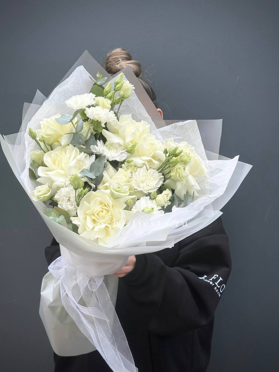 гортензия, диантус, хризантема, эустома, розы, озатамус, пленка.