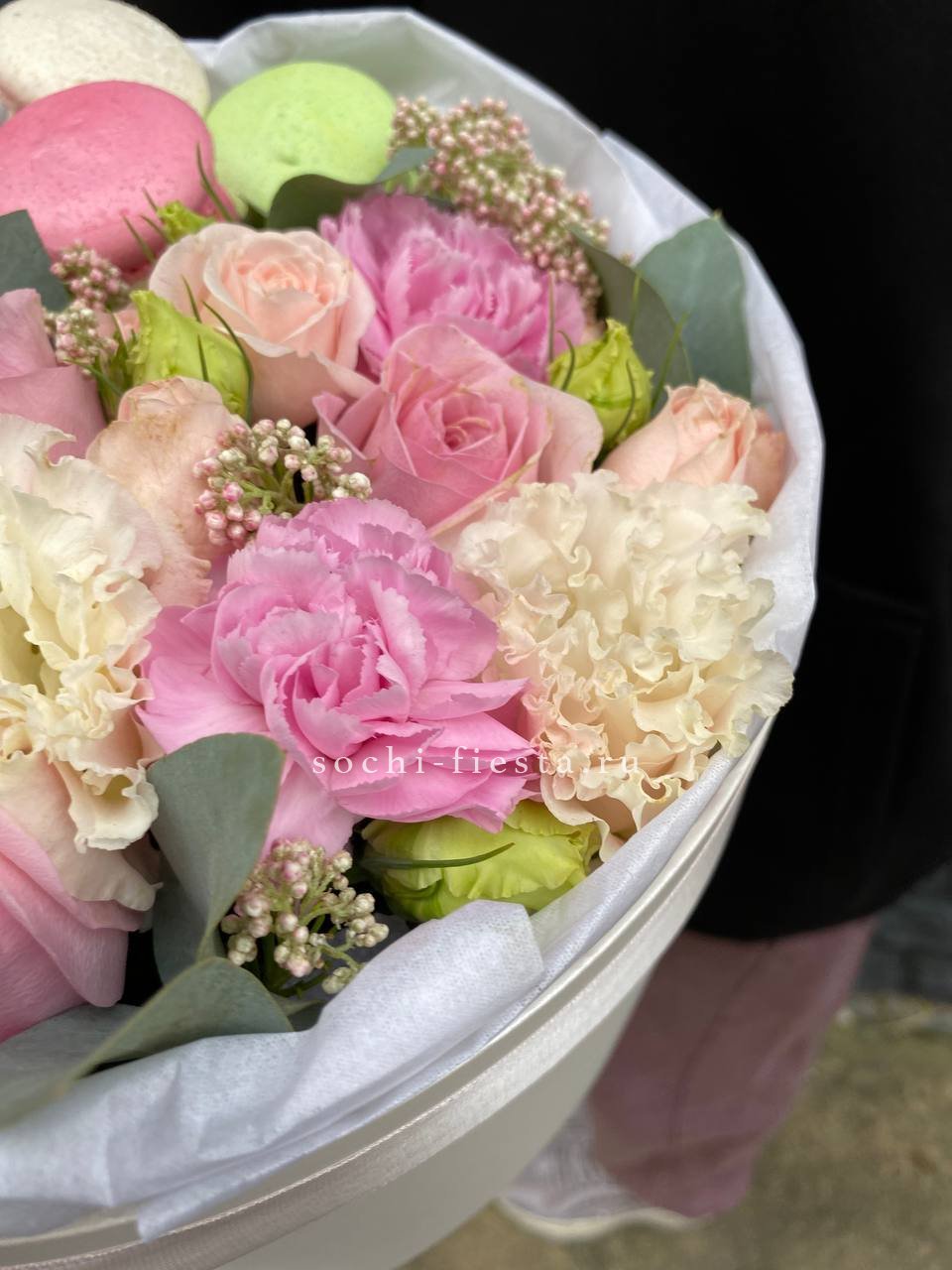 Розовые розы и диантусы окружены пышными соцветиями маттиолы и бомбастика. Композиция собрана плотно, каждый цветок поддерживает соседний, создавая объемную округлую форму. Букет держит силуэт и выглядит цельно с любого ракурса.