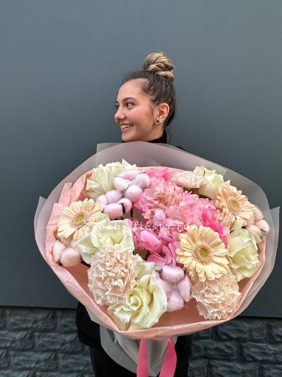 Пушистые соцветия гортензии сливаются с мягким хлопком и формируют объёмное облако. Герберы и диантусы вносят цветовые акценты, а розы завершают романтичную картину.