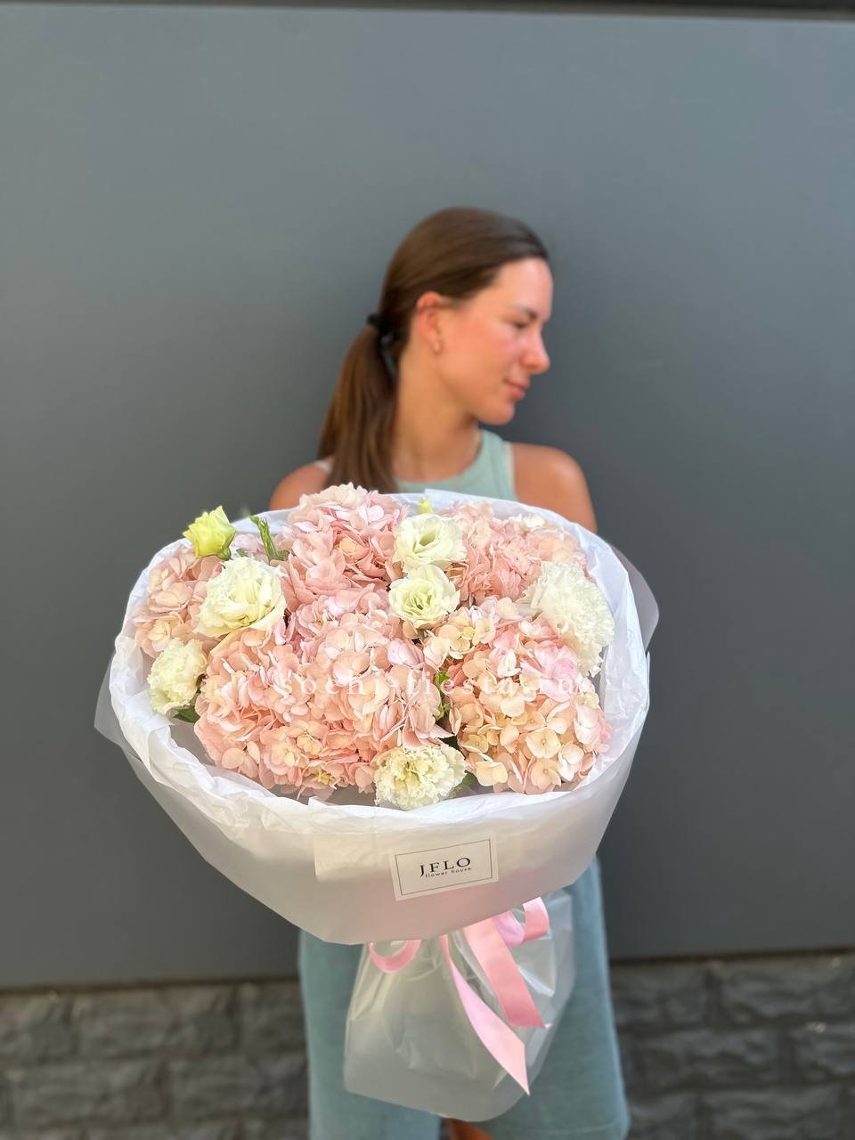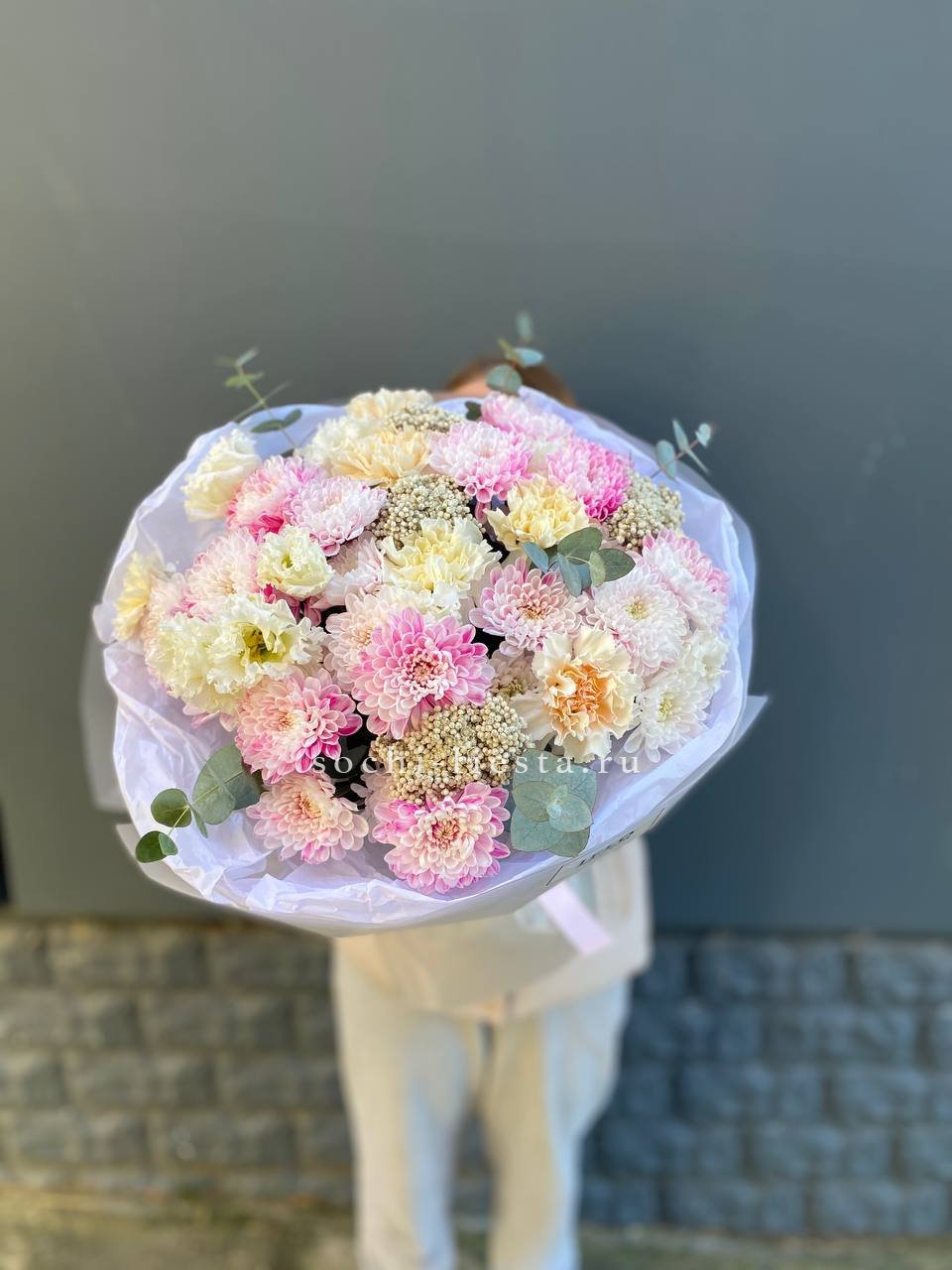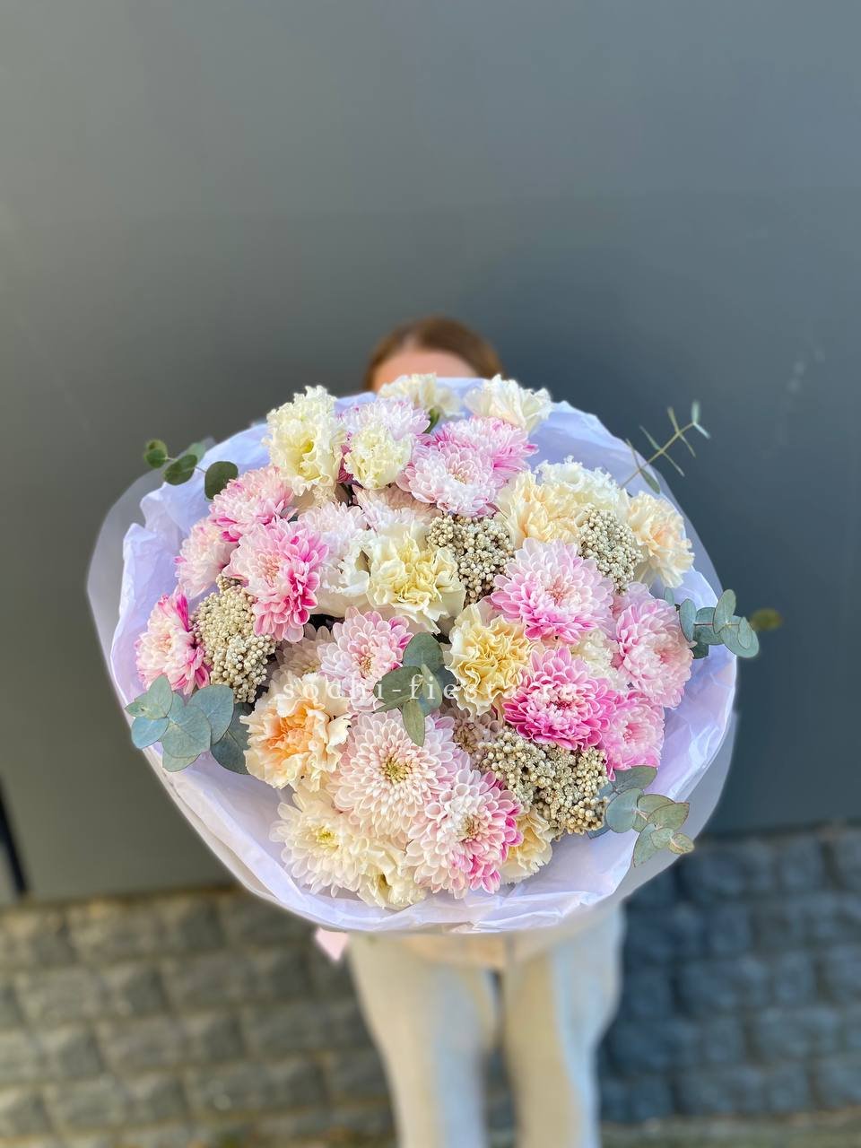 гортензия, французские розы, маттиола, лимониум, дианстусы, эвкалипт, ковыль и дизайнерская упаковка.