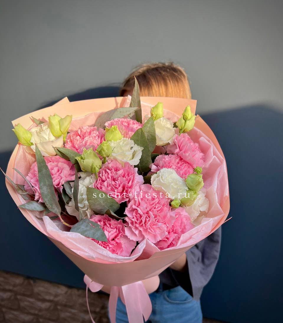 Пышные розовые бутоны переплетаются с воздушной эустомой, создавая объёмную композицию с мягкими переходами оттенков. Микс раскрывается постепенно, удерживая свежесть и форму долгое время. Универсальное решение для самых разных поводов.