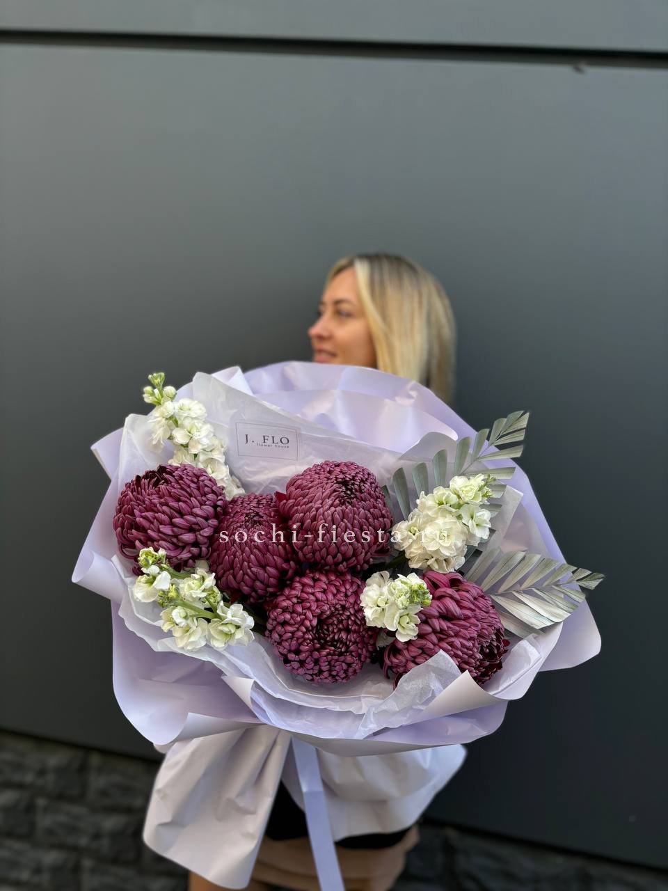 Графичные соцветия бигуди встречаются с воздушной маттиолой в неожиданном дуэте. Листья чики или эвкалипт расставляют акценты и создают глубину между яркими формами.