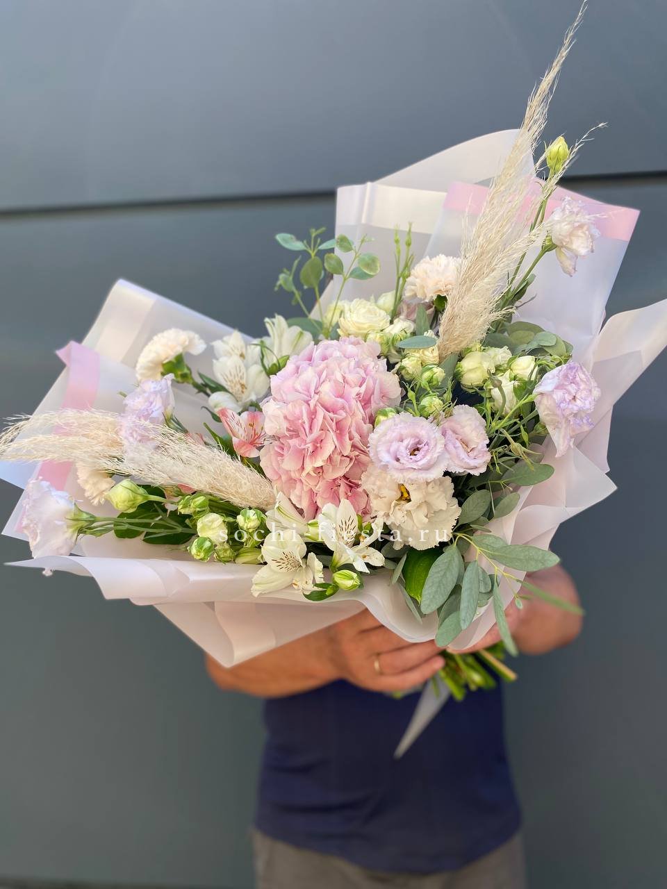 гортензия, эустома, кустовая пионовидная роза, альстромерия, диантус, лента, дизайнерская упаковка.