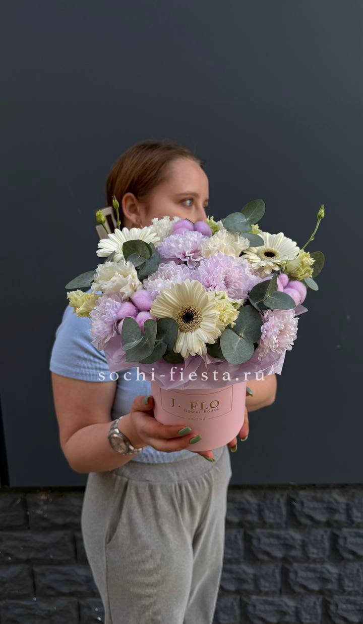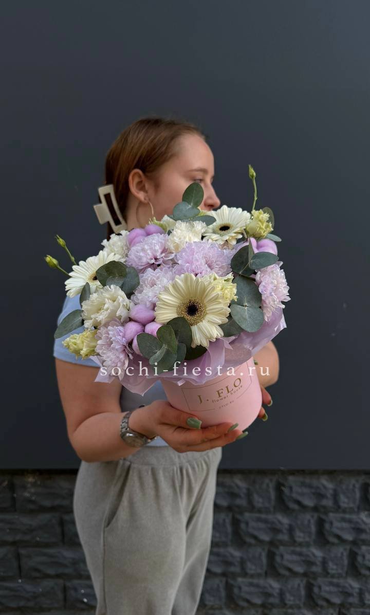 Пышная корзина с лилиями и гортензией собрана так, чтобы каждый цветок был виден и раскрыт. Розовые оттенки бомбастика перетекают в лиловый лимониум, создавая мягкую градацию. Эустома и диантус добавляют воздушности, эвкалипт завершает форму.