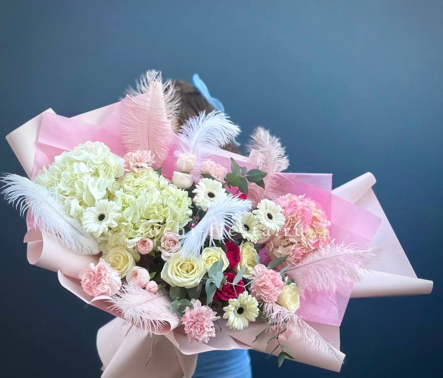 Пышный микс соцветий гортензии, роз и гербер с добавлением перьев и озотамнуса. Авторская композиция объединяет садовую свободу и графичную точность линий.