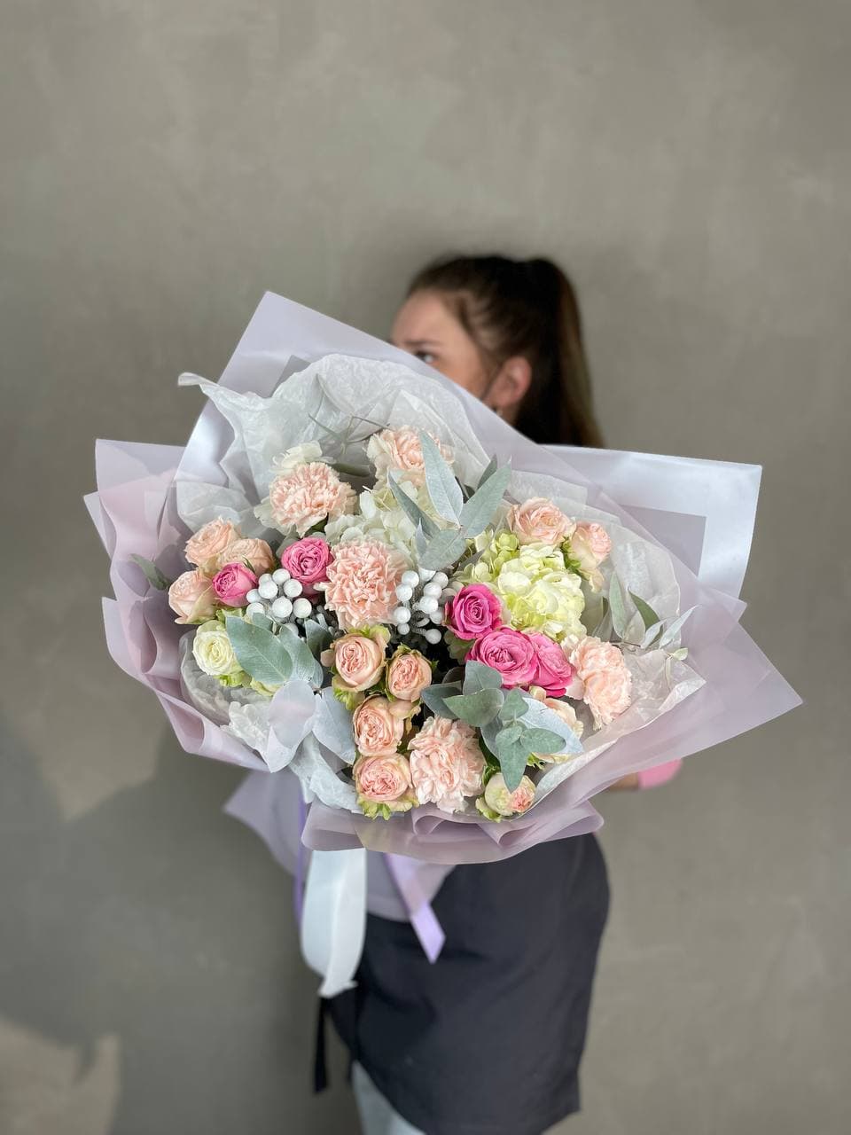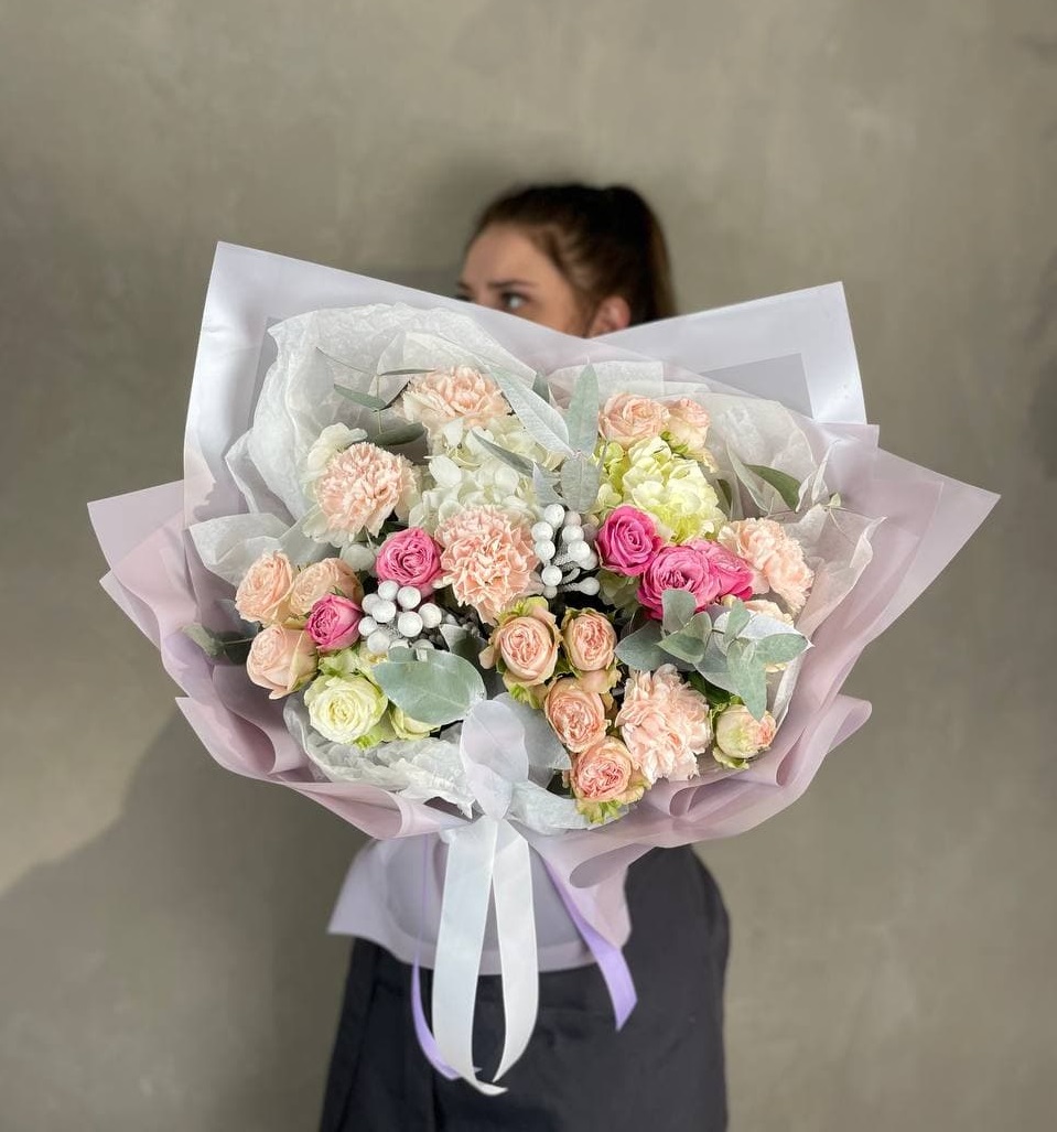 гортензии, роза одноголовая, роза кустовая, гербера, озотамнус, диантус, эвкалипт, декоративные перья, лента, дизайнерская упаковка.
