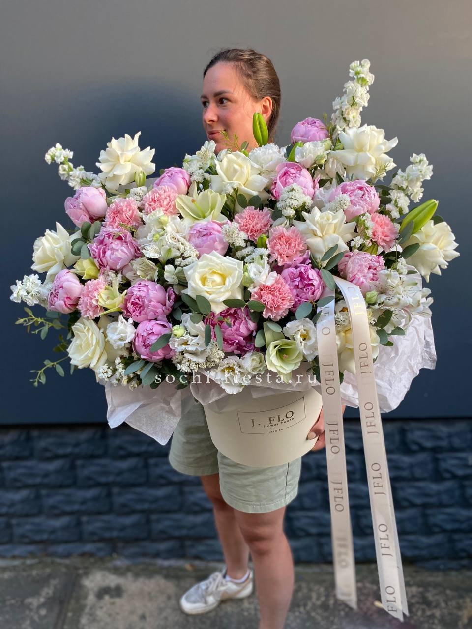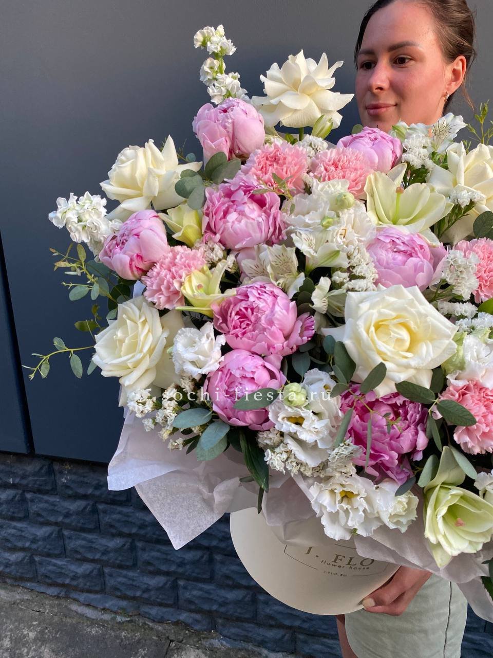 пионы, лилии, белые розы, эустомы, диантусы, маттиолы, статица, альстромерия, эвкалипт, цилиндр - D25, лента, упаковка. Состав может меняться в зависимости от сезона.