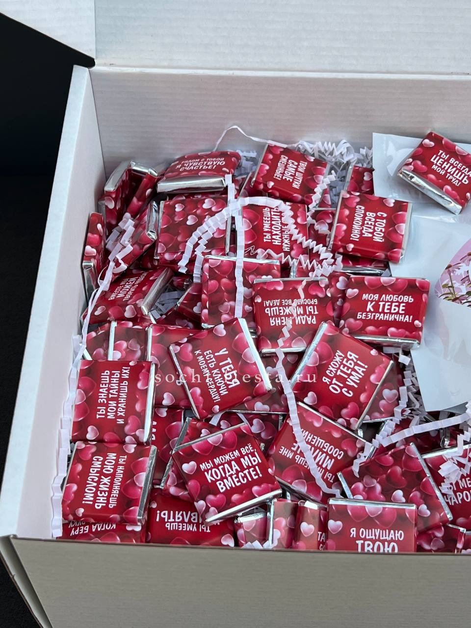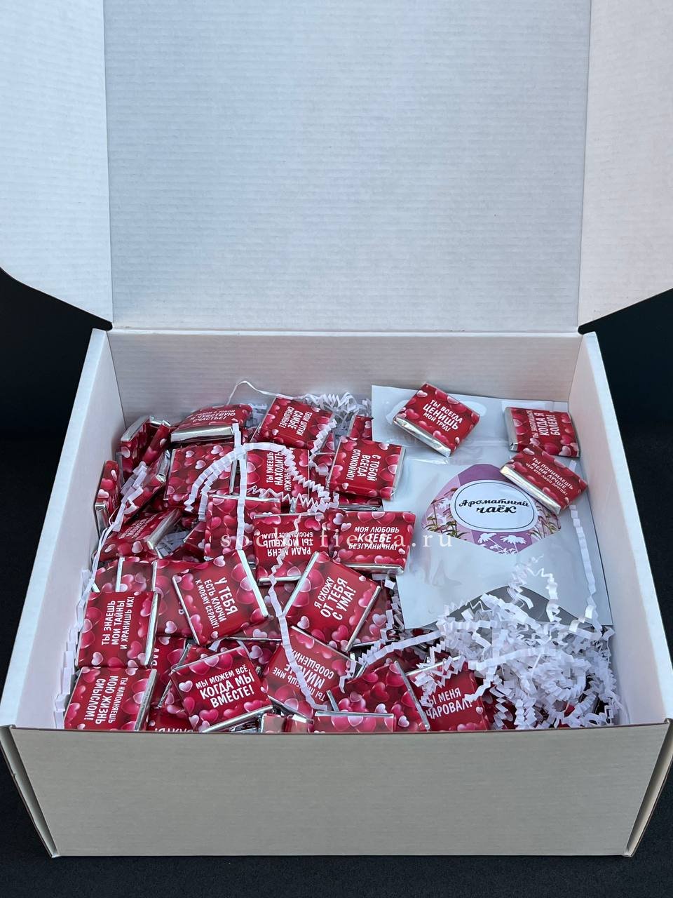 Сто одна плитка шоколада и чай в одном наборе превращают простую идею в визуальное высказывание. Повод написан цифрой, а эмоция считывается с первого взгляда.