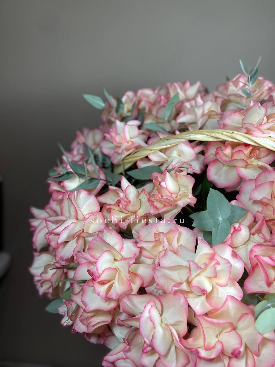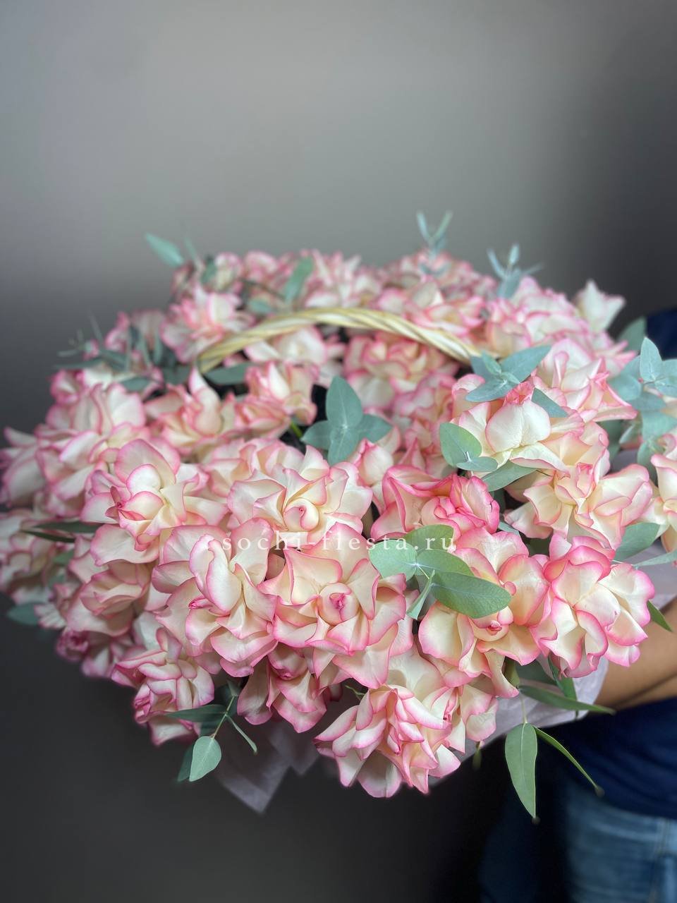 кустовые пионовидные розы Бомбастик, эвкалипт, цилиндр D13, бумага тишью, лента.