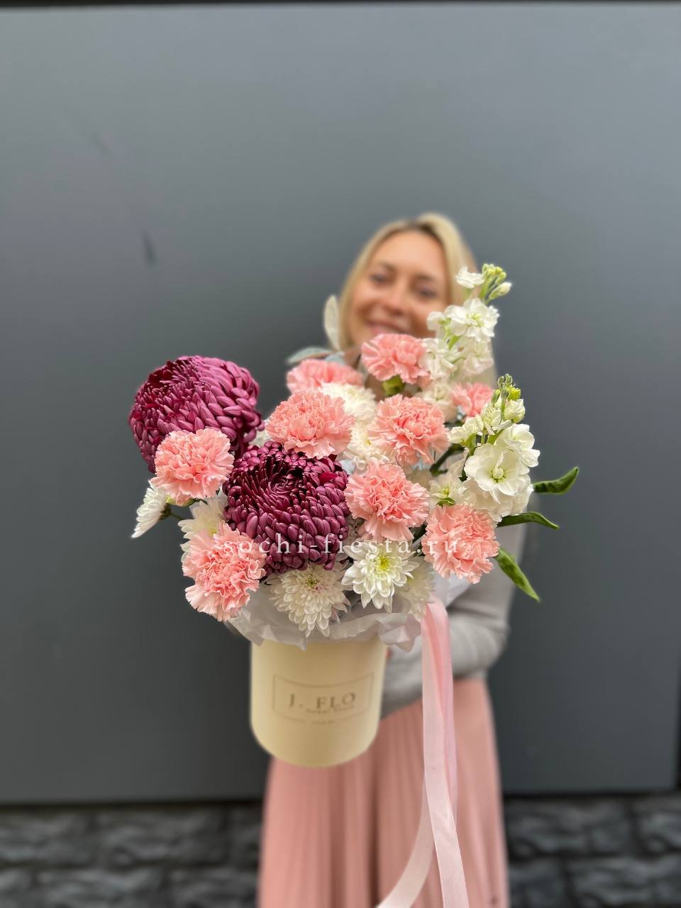 Хризнтема одноголовая, маттиола, диантус, тишью, коробка D13 Цвет коробки может быть согласован с заказчиком.