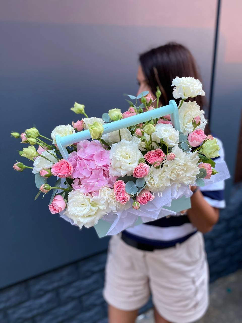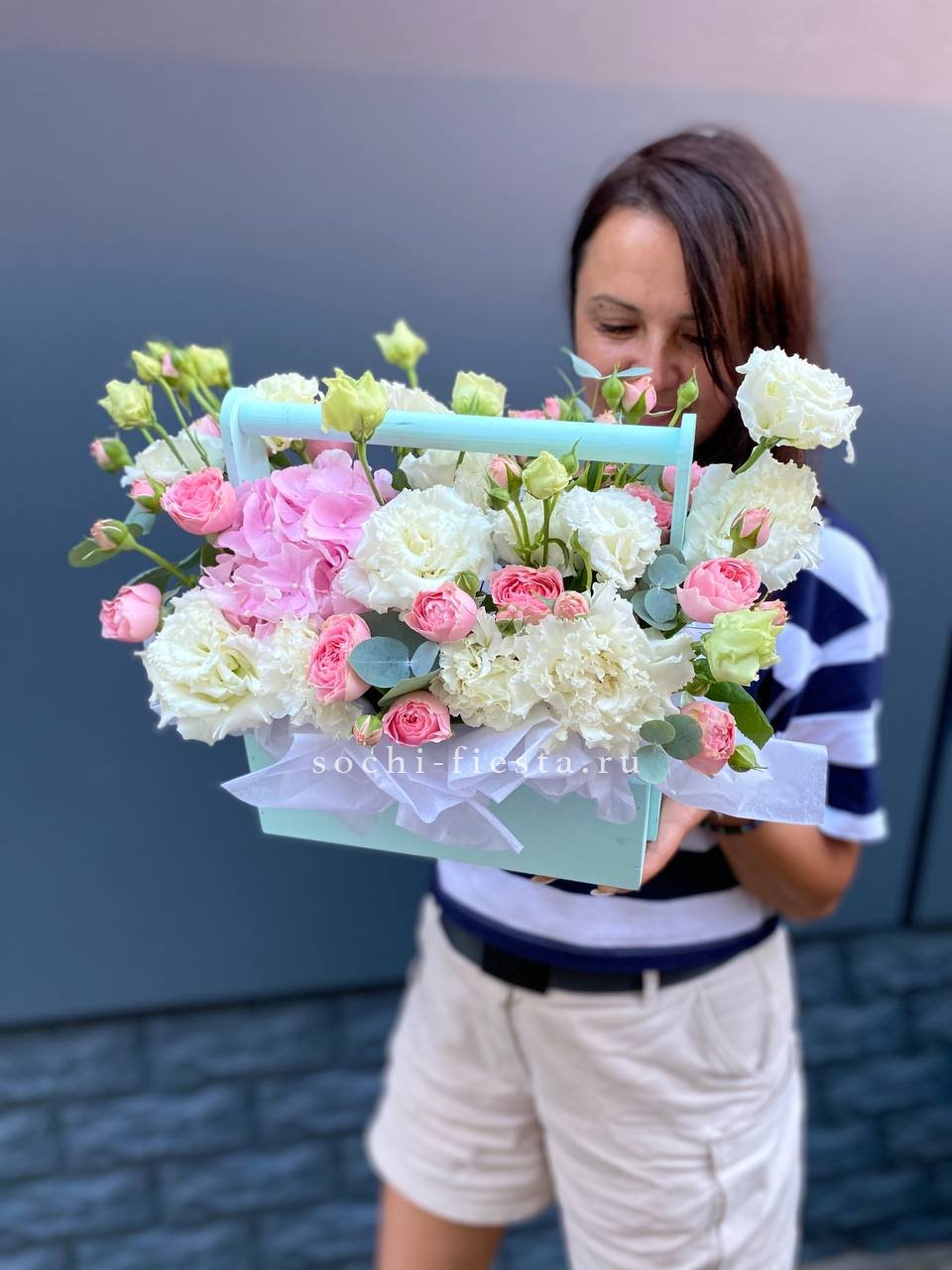 Деревянный ящик собрал в себе плотные бутоны кустовых роз, воздушную эустому и пышные соцветия гортензии. Зелень фисташки добавляет объём и завершает форму композиции.