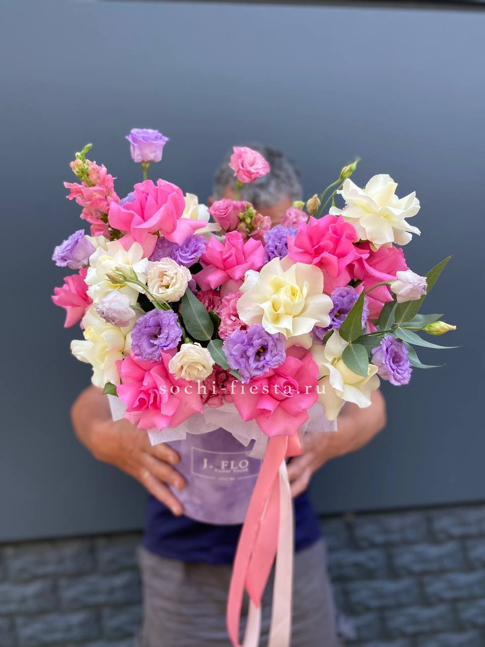 гортензия, вывернутые розы, диантус, кустовая роза, эустома, бокс D20, тишью.