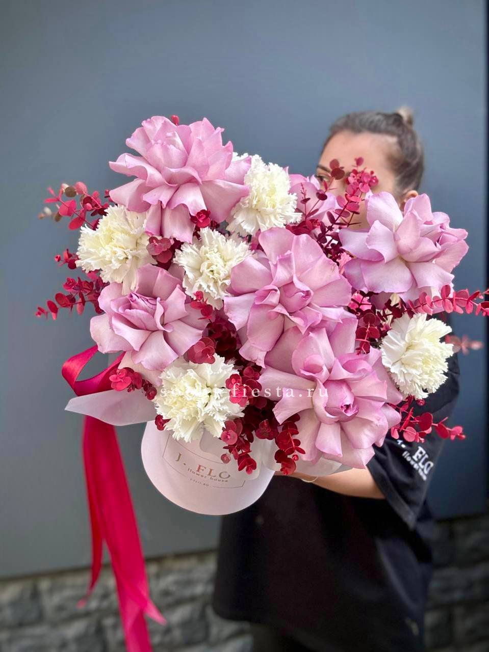 Французские розы цвета утренней зари дополнены воздушными соцветиями диантуса. Эвкалипт добавляет серебристые ноты и завершает округлую форму бокса.