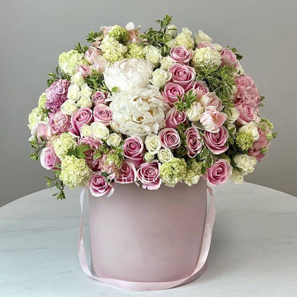 Пионовидная роза Бомбастик образует плотные бутоны с множеством лепестков. Эвкалипт добавляет свежести и завершает форму. Компактная коробка удобна для передачи из рук в руки.