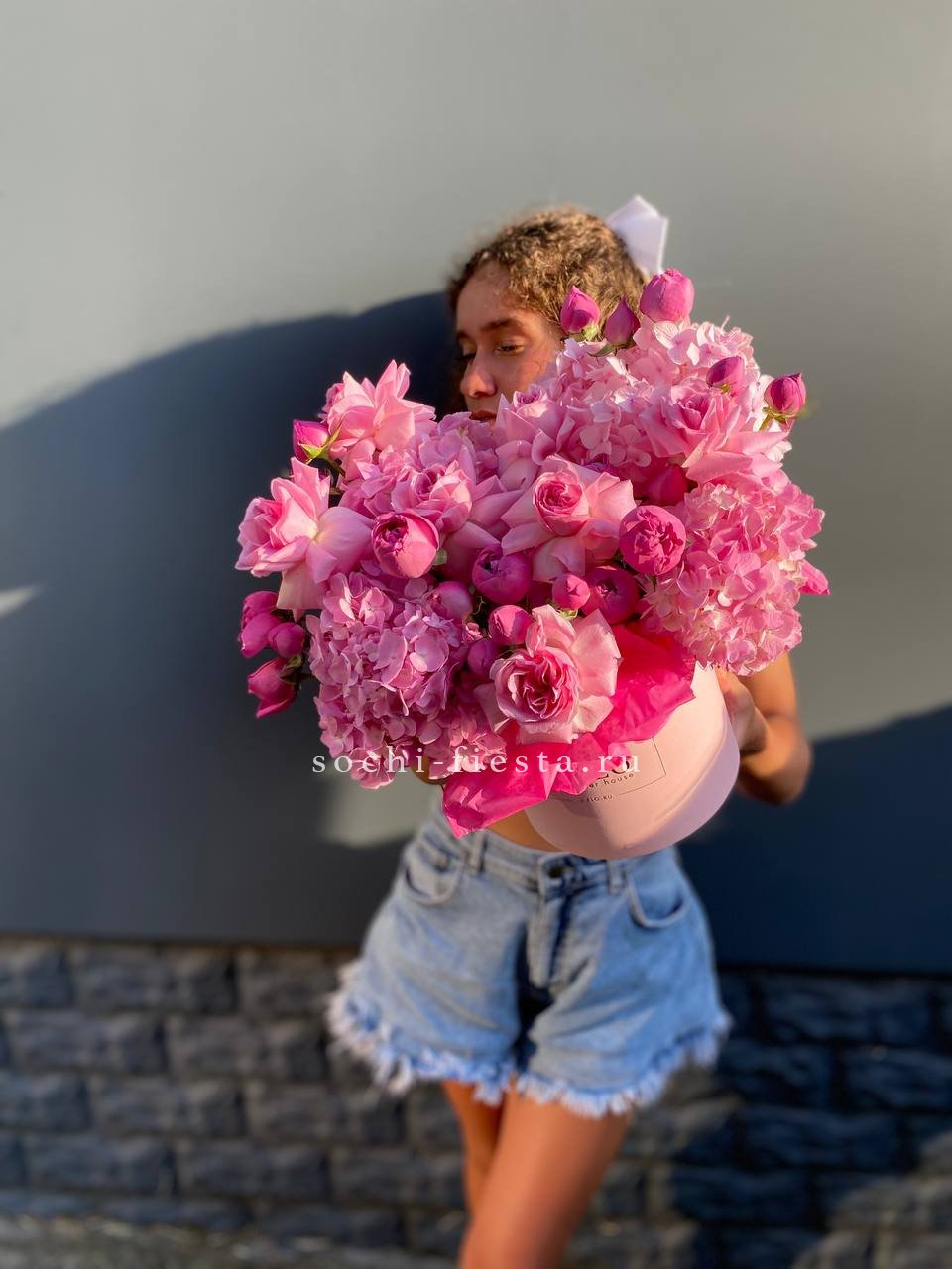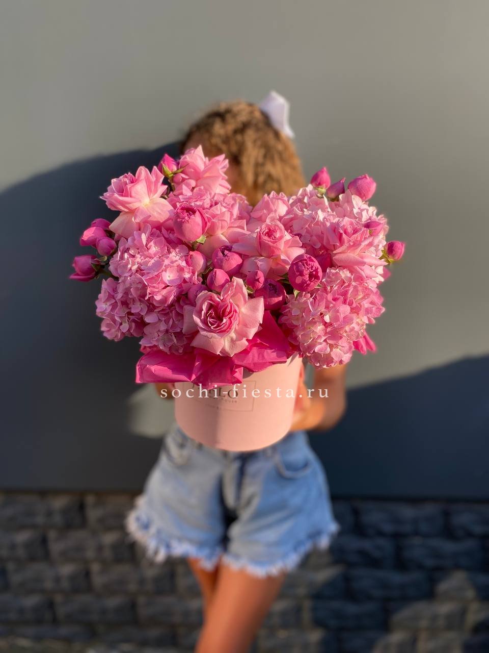Пионовидные бутоны и шапки гортензии заполняют бокс густой textured массой. Композиция держит форму и создаёт ощущение цветочной волны в ограниченном пространстве.
