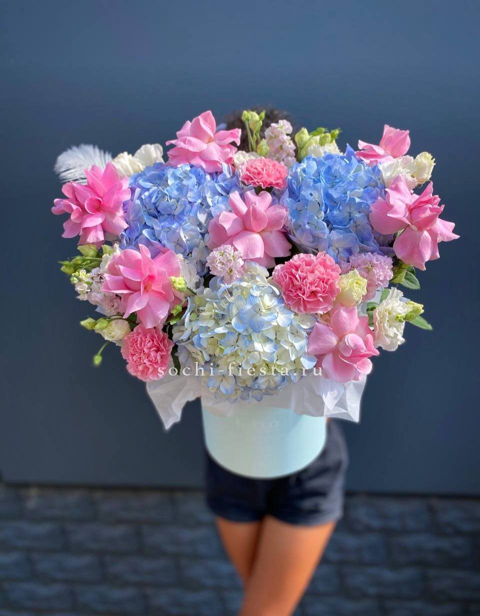 гортензия, кустовые розы, диантус, мисти баблс, эвкалипт, лента, цилиндр D16.