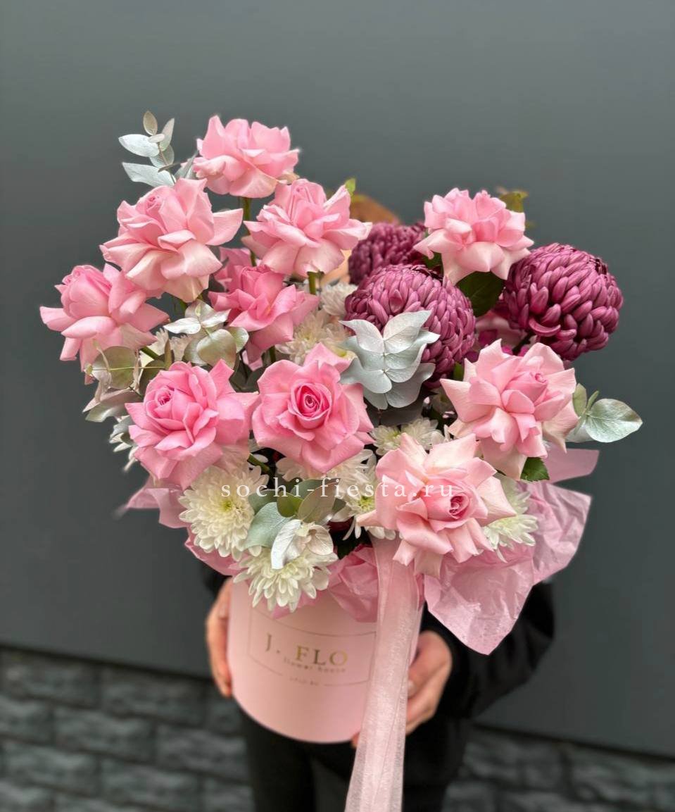 Яркая композиция в высоком цилиндре сочетает красные акценты французских роз с желтыми кустовыми хризантемами. Бигуди добавляет объем и визуальную динамику всей сборке.