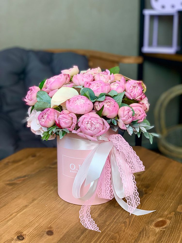 Пышные головки пионов собраны в плотную круглую форму и дополнены свежими ветками эвкалипта. Композиция в цилиндре держит силуэт и создаёт яркое присутствие в интерьере.