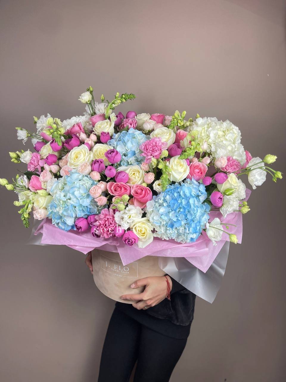 Воздушная композиция в бархатной коробке раскрывается пышными соцветиями гортензии и многолепестковыми бутонами эустомы. Розы двух оттенков создают мягкий переход от белоснежного к пудровому. Флористическая пена сохраняет свежесть каждого цветка надолго.