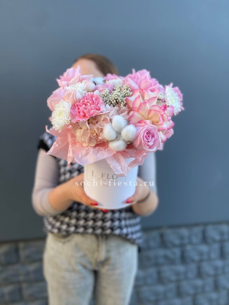 Воздушные соцветия гипсофилы переливаются радужными оттенками в компактном цилиндре. Лёгкая текстура наполняет пространство. Композиция выглядит свежо и современно.