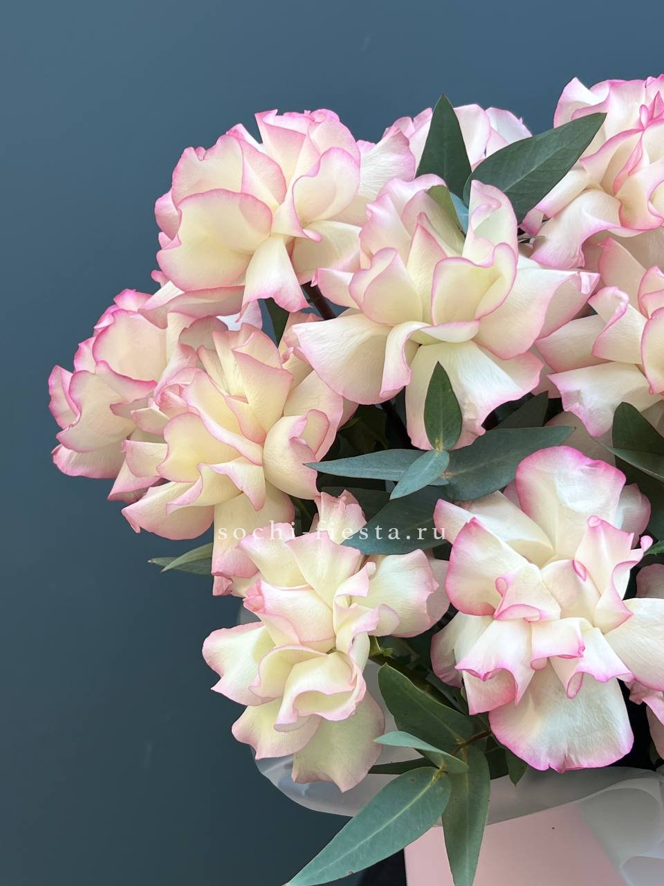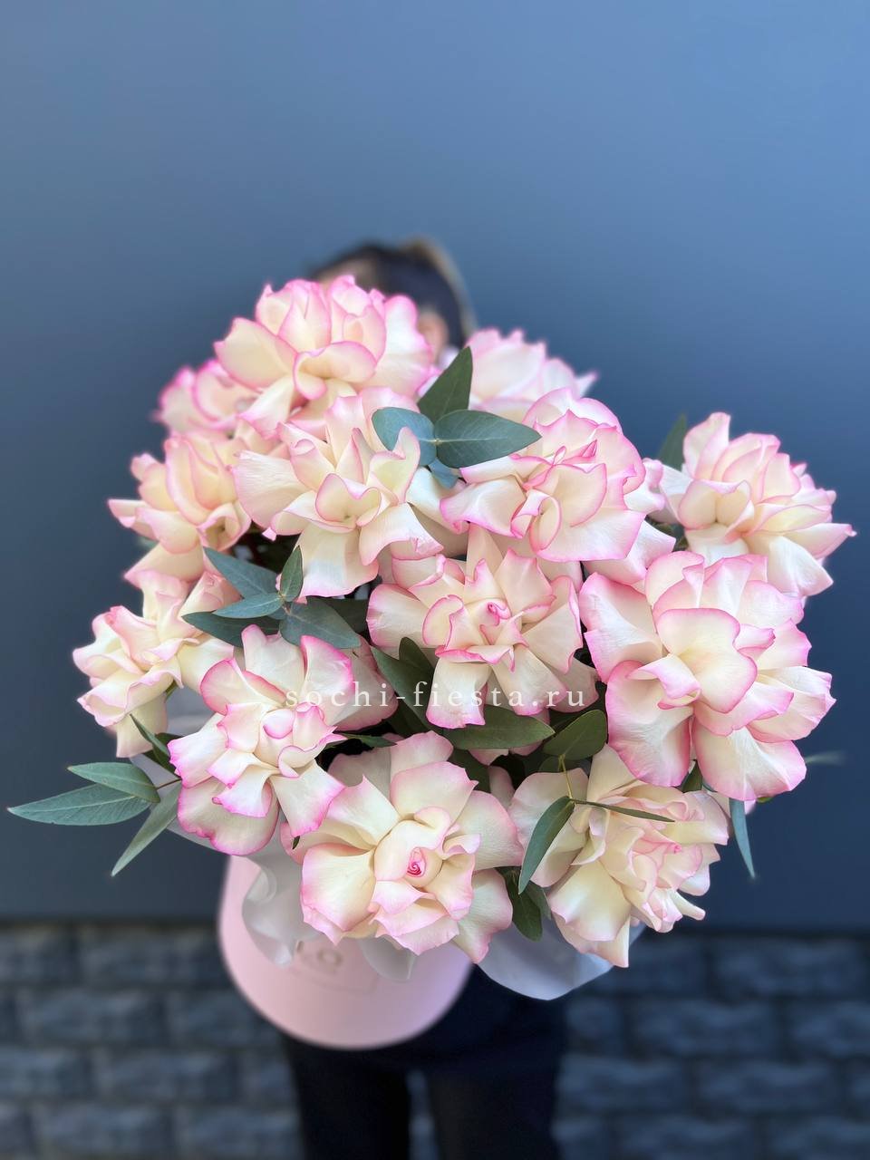 Семь веточек кустовой розы Мисти баблс собраны в круглую форму и дополнены свежим эвкалиптом. Компактная коробка с воздушной бумагой тишью сохраняет композицию аккуратной и готовой к вручению.