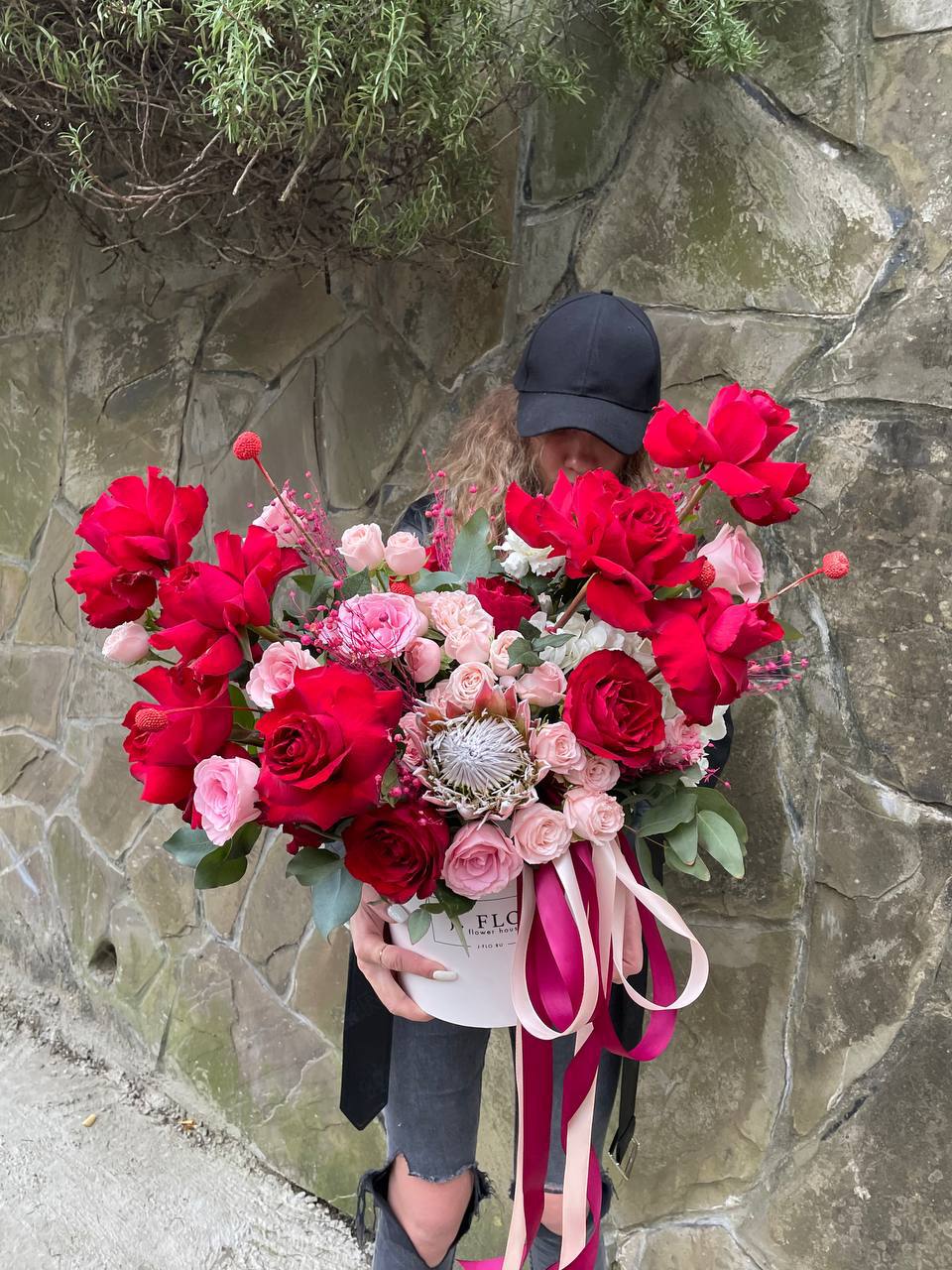 красные розы, розовые, протея, бомбастик, гортензия, бокс 20, сухоцветы.