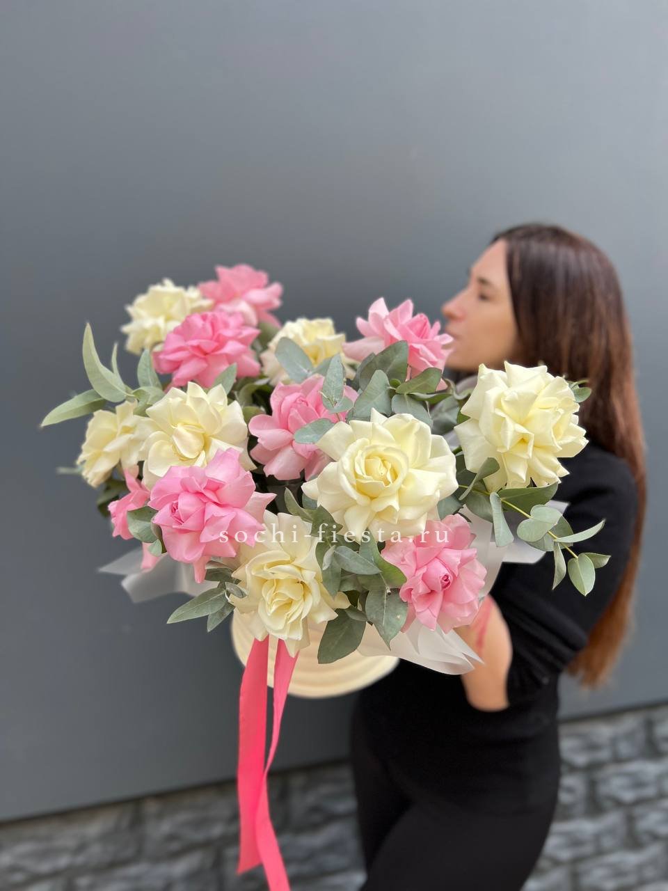 Семнадцать французских роз в пастельном миксе собраны в круглую форму. Композиция компактна и выразительна благодаря сочной зелени эвкалипта.