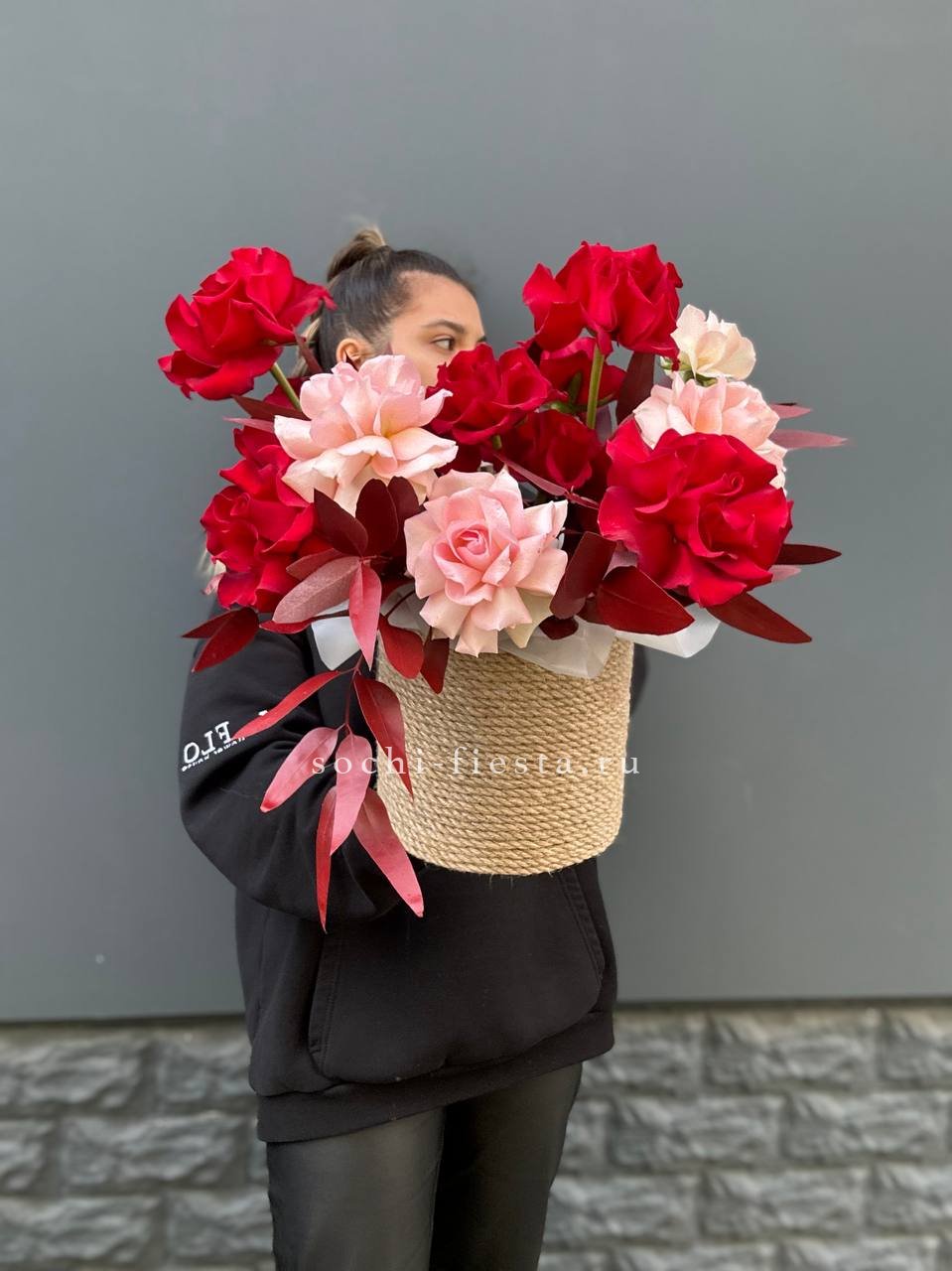 роза французская, эвкалипт, лист Чико (аналог), джутовое кашпо, оазис.