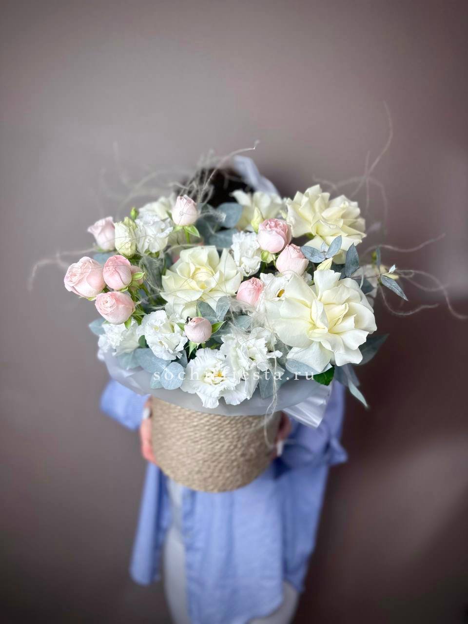 гортензия, белые розы, диантус, бомбастик, эустома, лимониум, эвкалипт, бокс 25 в джуте.