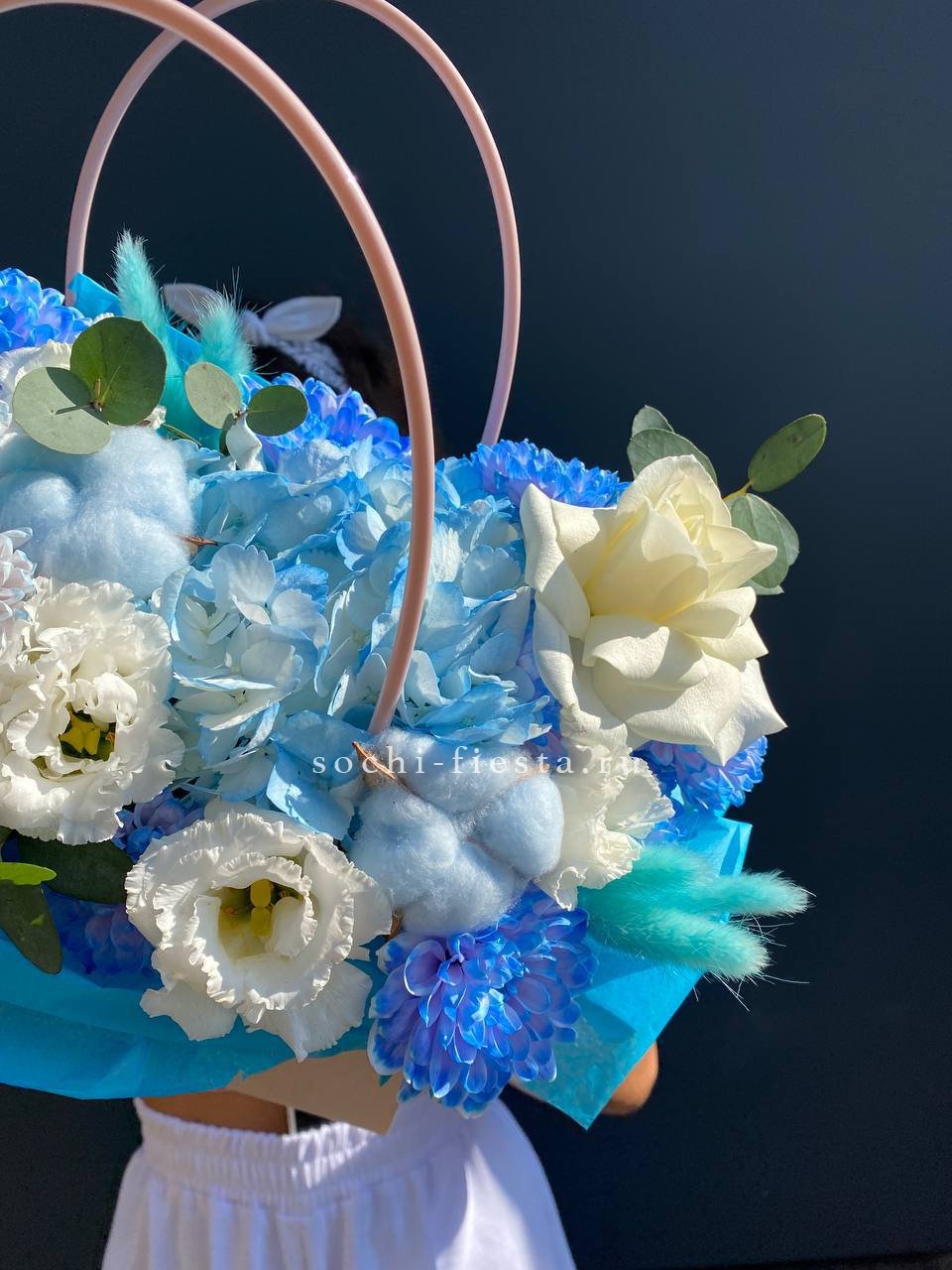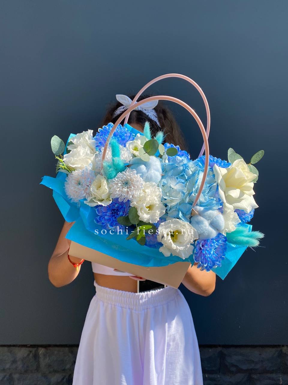 герберы, диантусы, альстромерии,  лента, эвкалипт,  сумка-кашпо.
