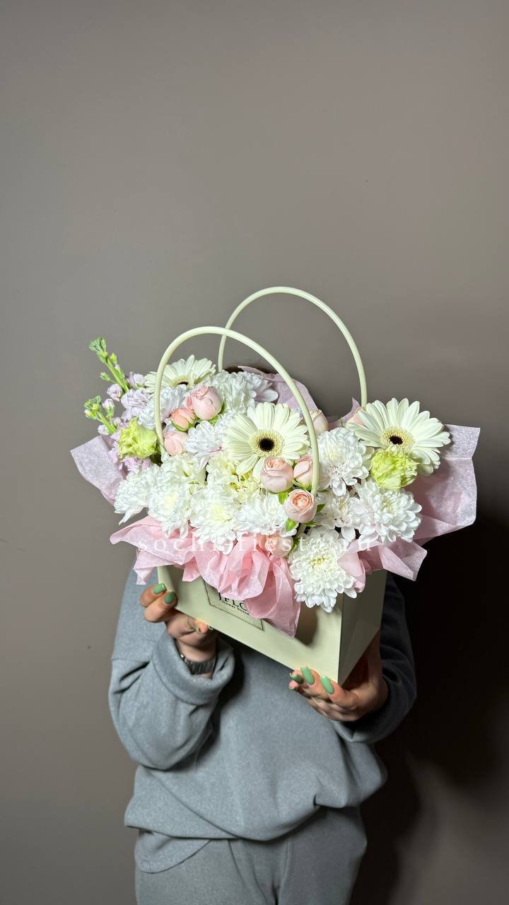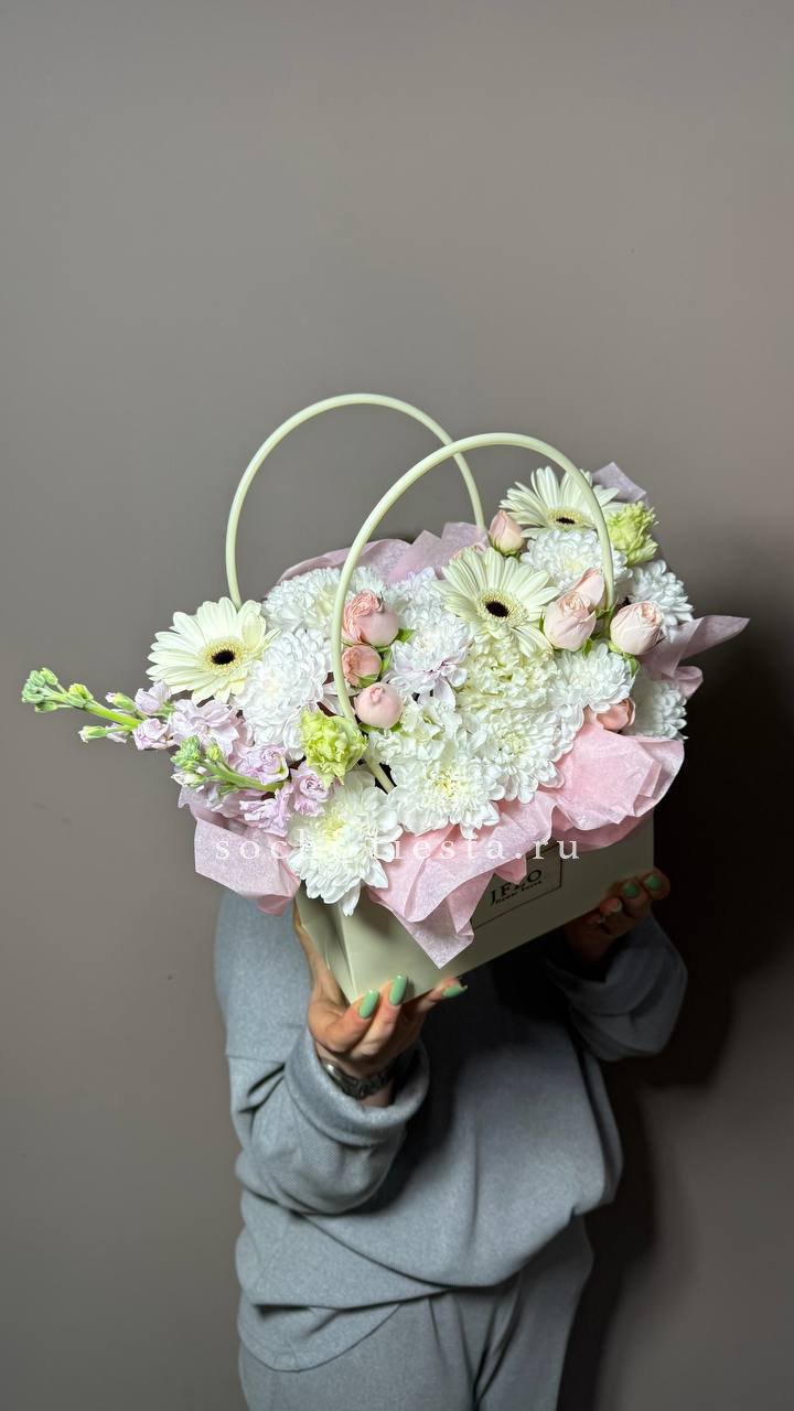 Герберы и альстромерии собраны в яркую компактную композицию. Диантусы заполняют пространство между соцветиями и создают лёгкую дымку. Удобный формат в сумке-кашпо для размещения на столе или полке.
