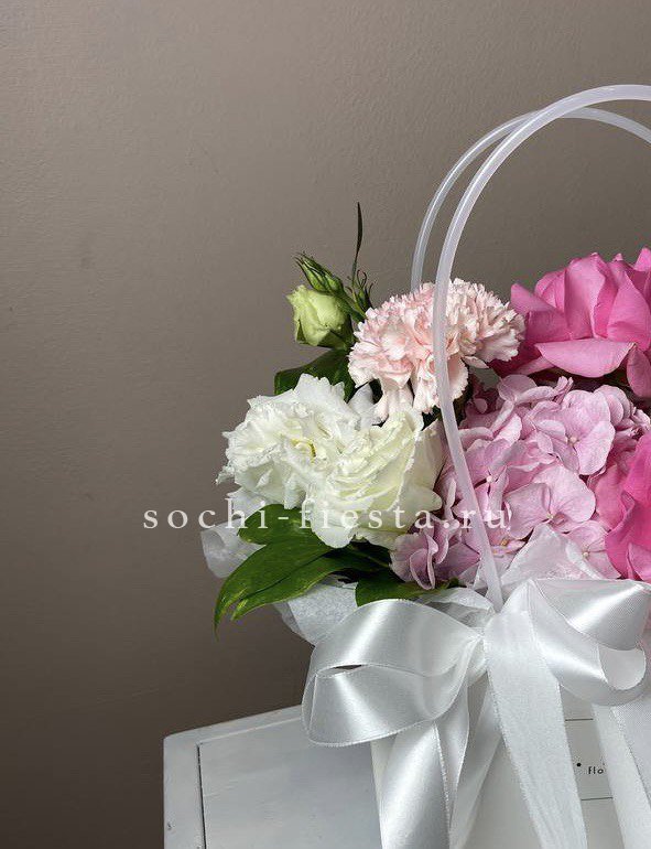 Гортензия заполняет пространство пышными соцветиями, розы и эустома расставляют акценты. Диантус и эвкалипт дополняют картину зеленью и мелкими деталями. Компактная форма удобна для размещения.