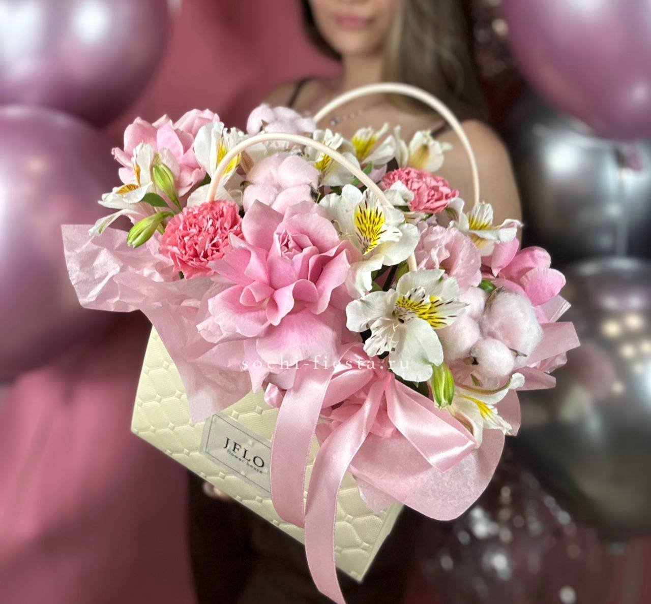 гортензия, розы, эустома, эвкалипт, диантус, лента, сумка.