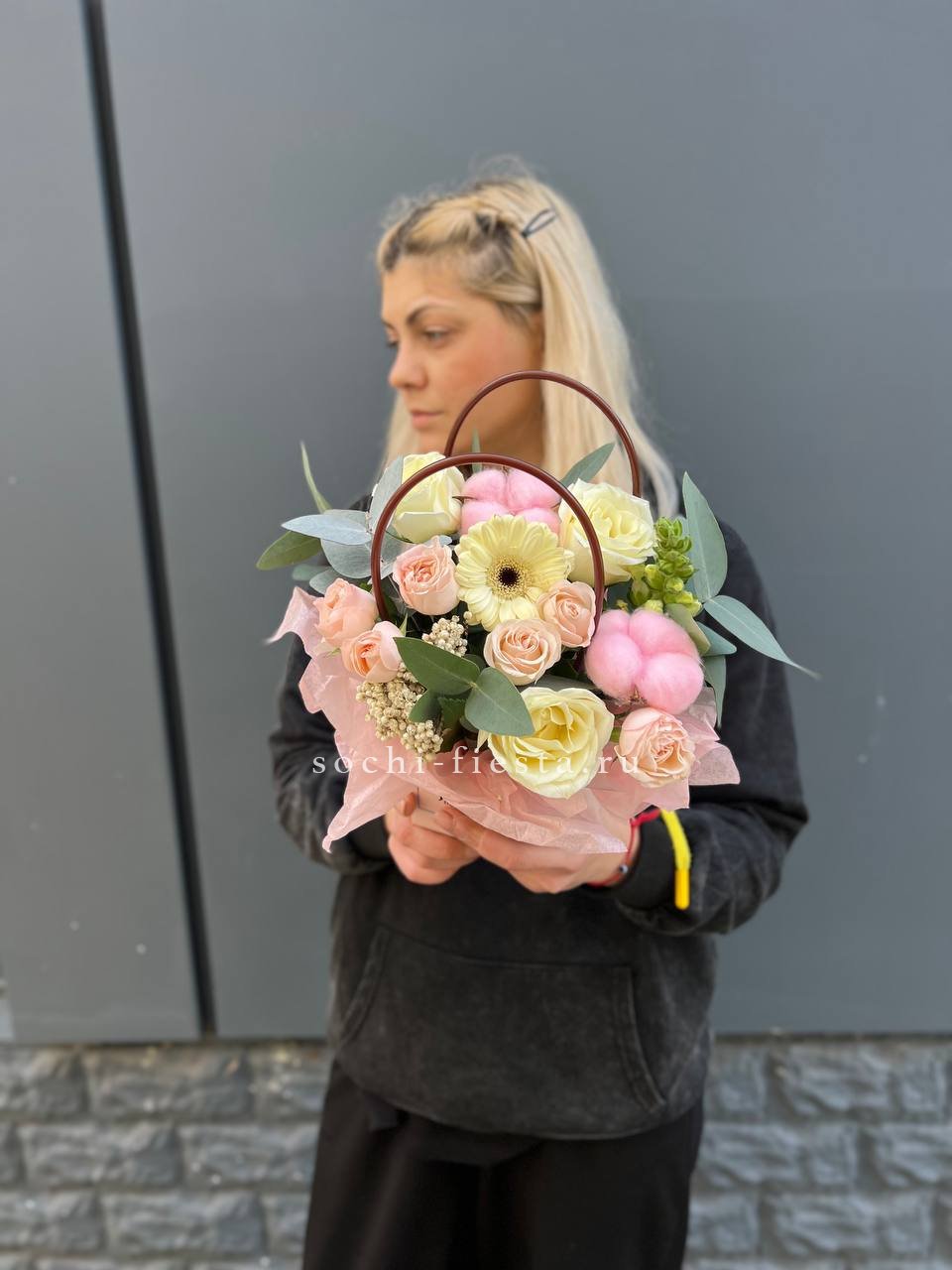 гортензия, розовые розы, эустома, диантусы,эвкалипт, лента, сумка-кашпо.
