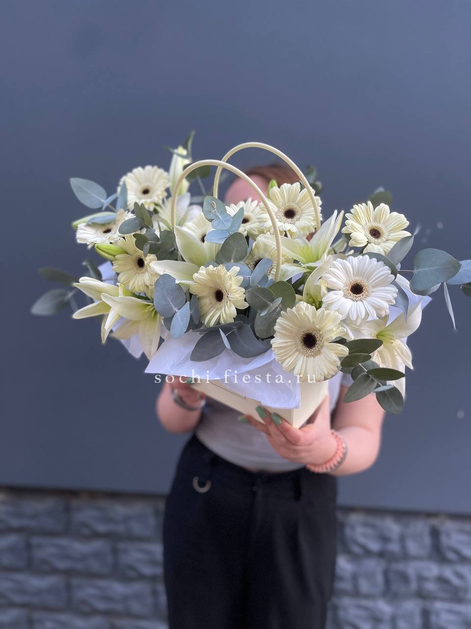 сумочка в белых тонах с лилией, герберой и эвкалиптом.