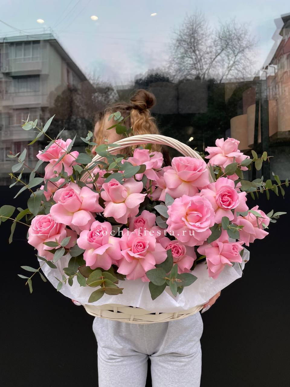 555 роз, зелень (папоротник или эвкалипт, в зависимости от сезона) оформление в корзину. Длина надписи не должна превышать 4 букв.