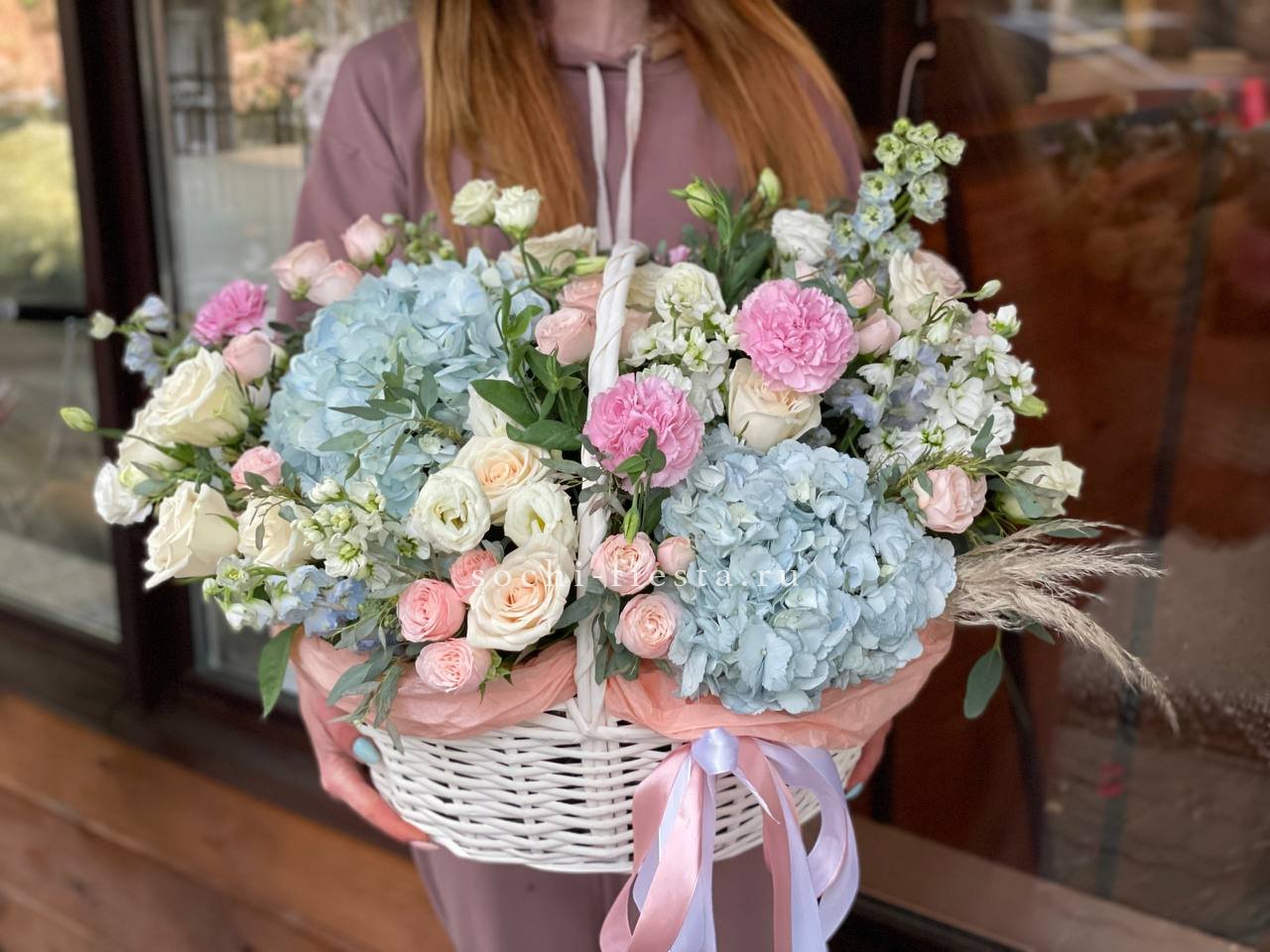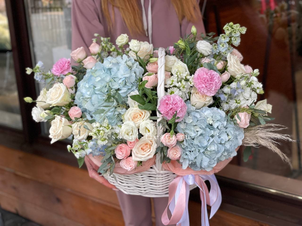 Корзина объединяет гортензии, эустомы, розы и маттиолу в многослойную композицию. Разные фактуры лепестков создают визуальную глубину и насыщенность.
