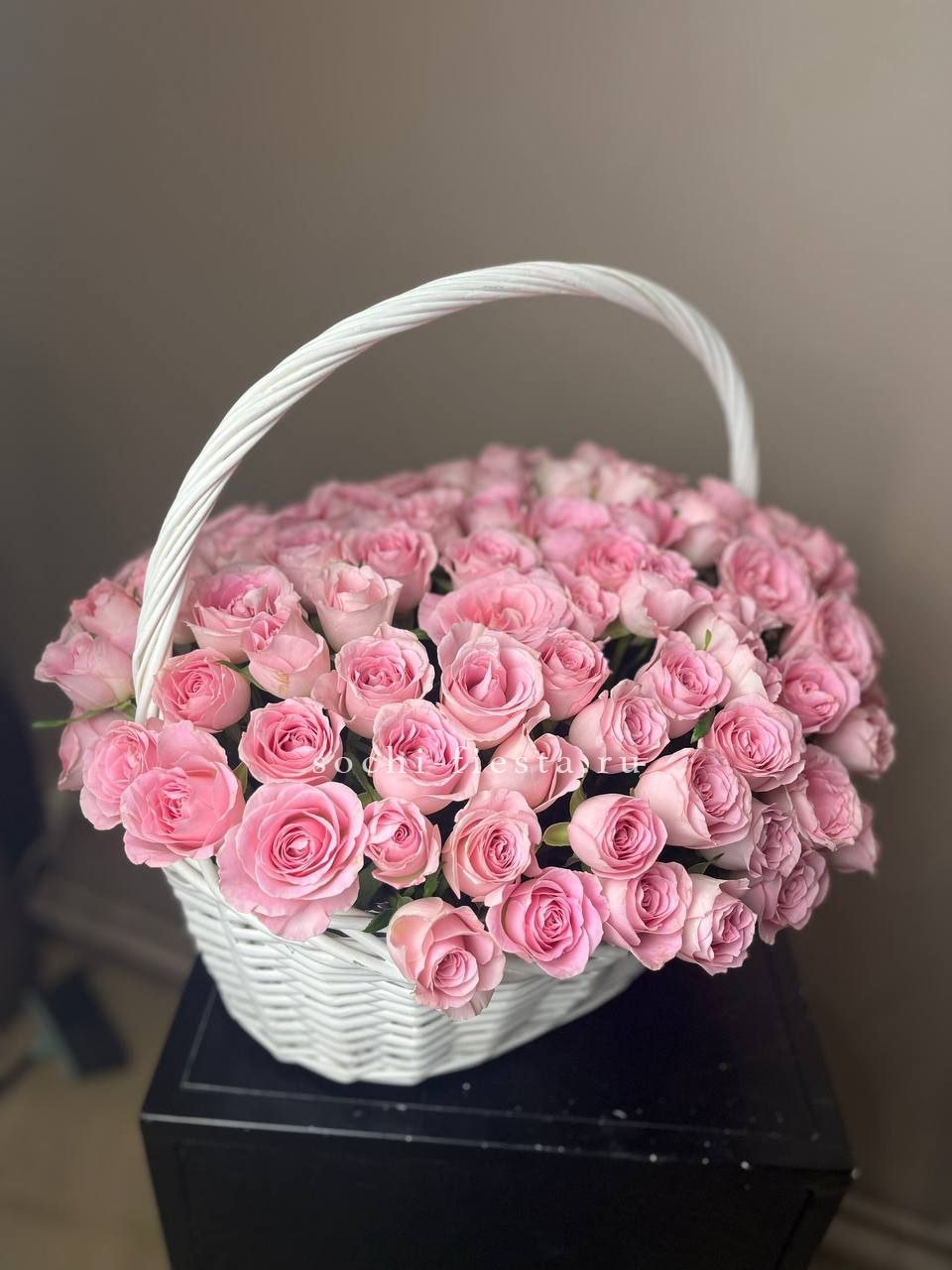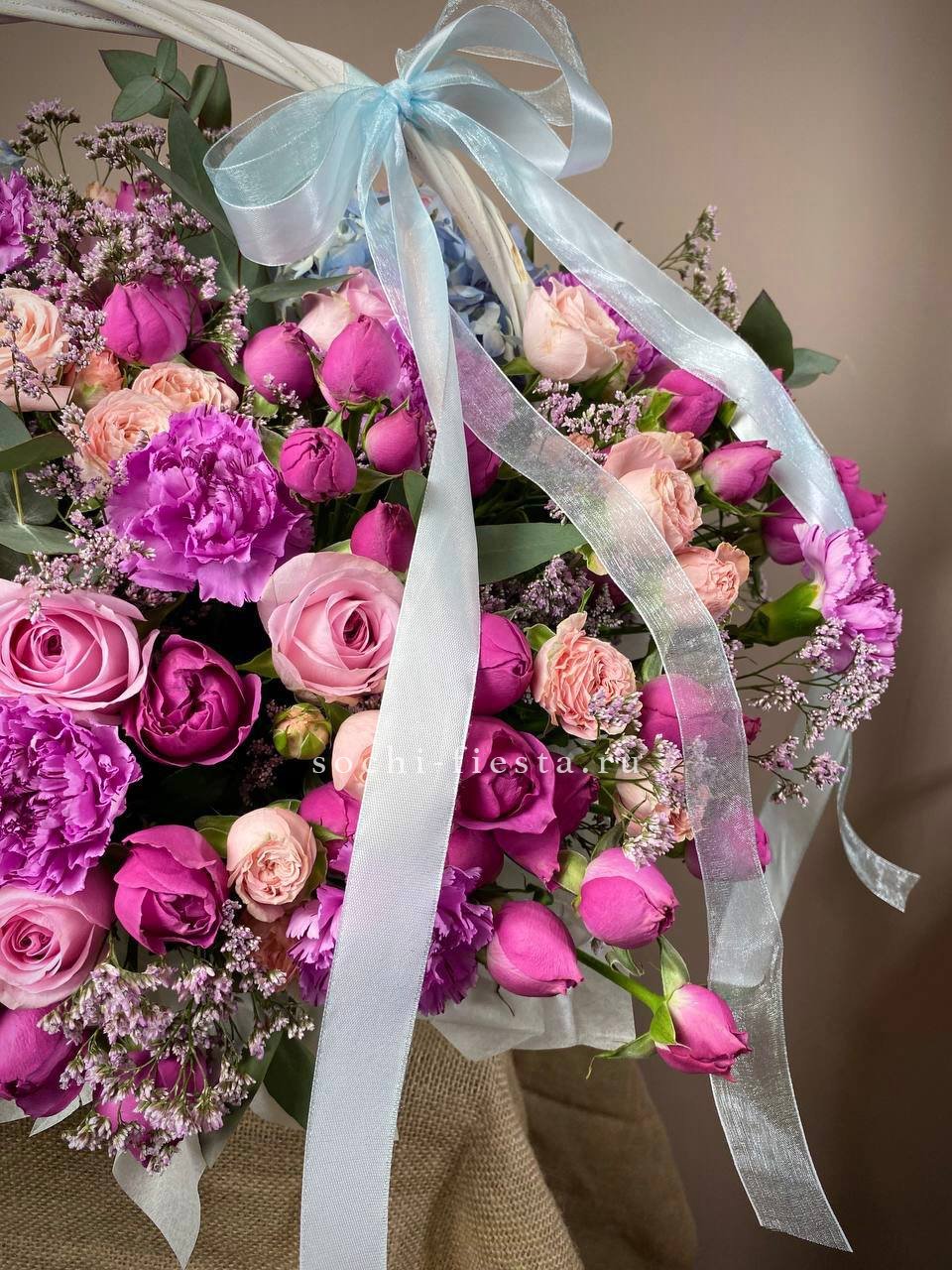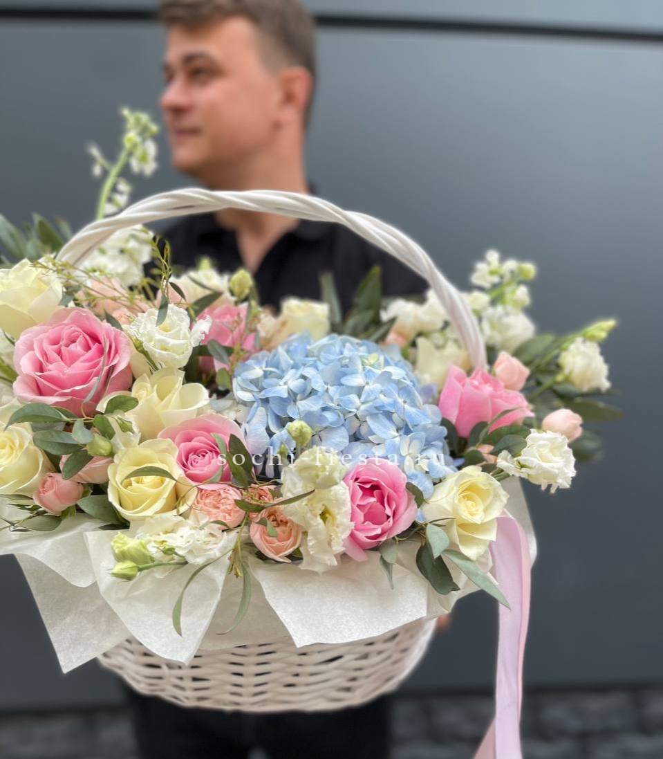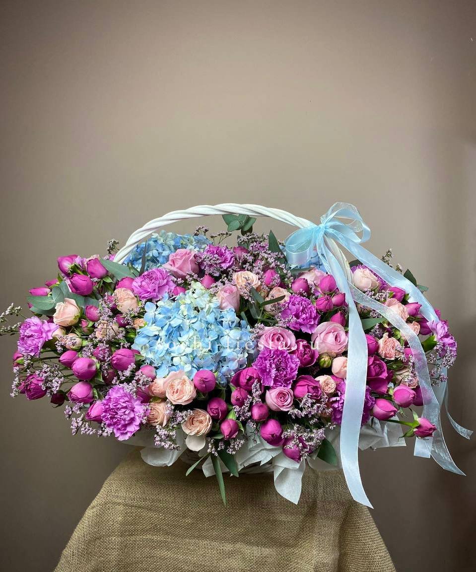 цветочная корзина с розами, мисти баблс, диантусами и гортензией.