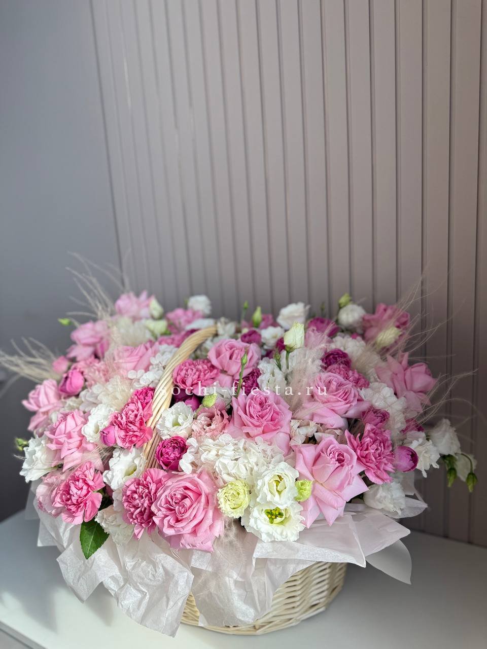 роза одноголовая, роза пионовидная, альстромерия, эустома, гортензия, ковыль, диантус, плетеная корзина.