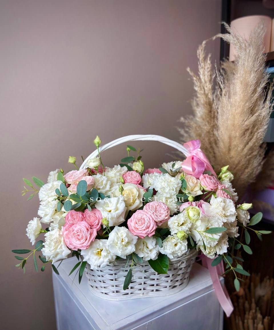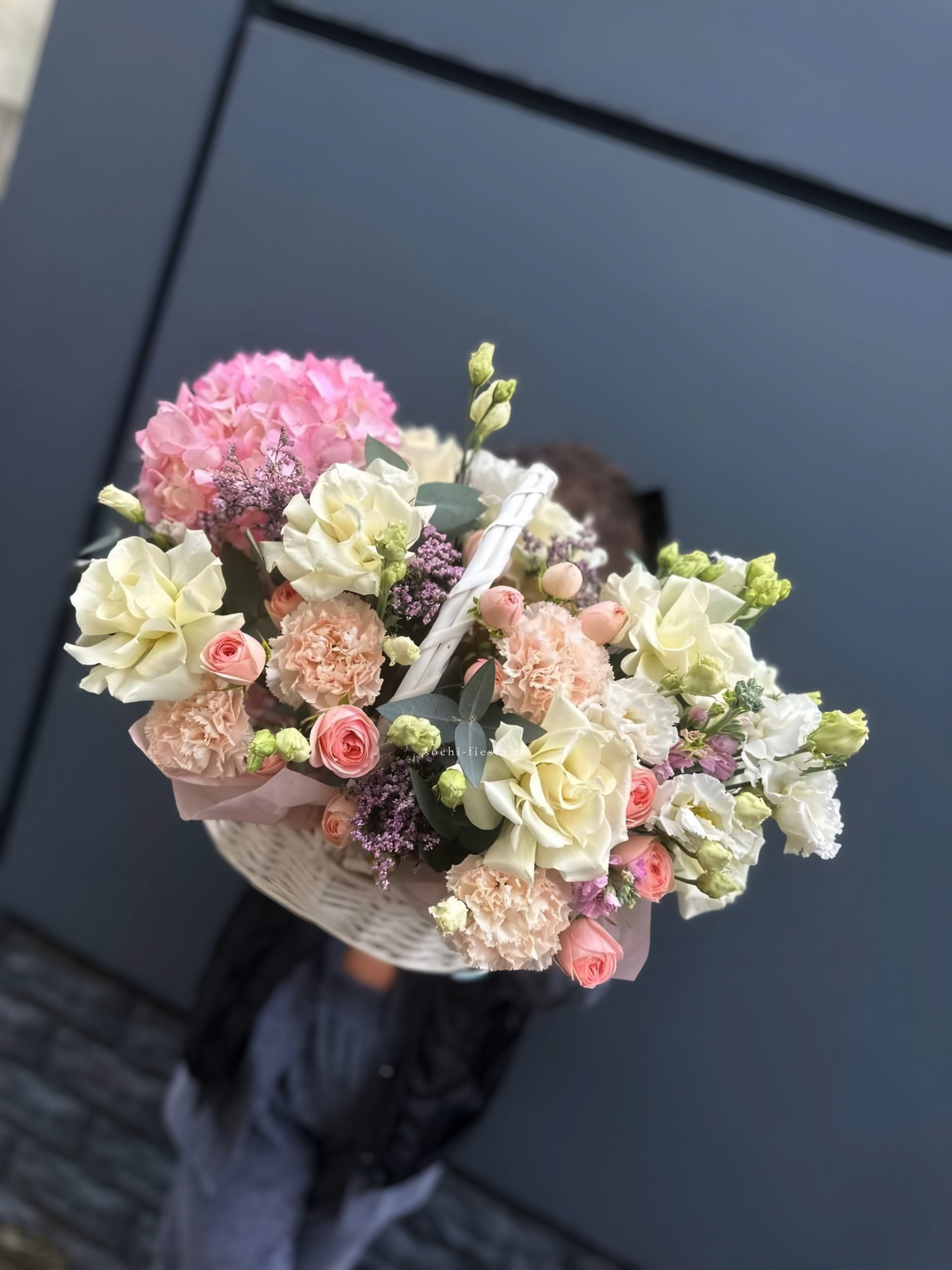 Масштабная корзина объединяет лилии, гортензии, антиринум, розы и эустому в единую объёмную композицию. Высота и насыщенность каждого слоя создают впечатление цветочного изобилия.